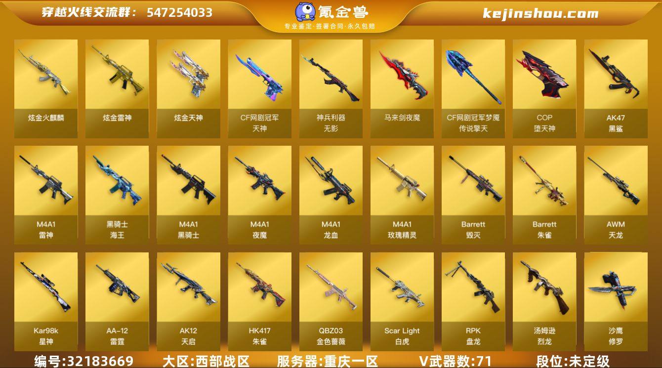 重庆一区-74V-2王者武器数-3炫金武器数 【热门武器】:QBZ03-金色蔷薇,Scar Light-白虎,HK417-朱雀,死亡之眼,QBZ03-街机,Kar98K-星神,M4A1-黑骑士,汤姆逊-烈龙*7,RPK-盘龙,加特林-炼狱,COP-堕天神*2,沙鹰-修罗*2 【王者炫金武器】:炫金火麒麟,炫金雷神,炫金天神 【音效卡】:M4A1-雷神音效卡,Barrett-毁灭音效卡 【皮肤】:雷神-星空,火麒麟-平天大圣,毁灭耀金皮肤,黑骑士-电玩青兔皮肤,战神-紫绶金章皮肤,天龙-能量核心,极光-能量核心,修罗-能量核心 【角色】:迷迭香,风暴女,嘉年华灵狐,娟娟,潘多拉-X,潜龙队-X,青霞仙子 【人偶武器】:AWM-灵狐-15周年嘉年华,M37-葵*2,迷你牛魔王,迷你超能女侍 【暴走生化】:死亡之眼,超级对讲机 【挑战大师】:冰龙粉碎者-白马银枪,VEPR-12-金魔*4,神圣爆裂者-末日III*2 【英雄级武器】:M4A1-雷神,M4A1-黑骑士,AK12-天启,AK47-黑鲨,M4A1-龙血,HK417-朱雀,Scar Light-白虎,M4A1-夜魔,无影-神兵利器,M4A1-玫瑰精灵,QBZ03-金色蔷薇,王者之魄-觉醒版,AK-47-猩红传说,黑骑士-海王,黑武士-CF网剧冠军,AWM-天龙,Barrett-毁灭,Barrett-朱雀,Kar98K-星神,Barrett-金色蔷薇*2,王者幻神-觉醒版,RPK-盘龙,加特林-炼狱,汤姆逊-烈龙*7,AA-12-雷霆*2,沙鹰-修罗*2,COP-堕天神*2,柯尔特-电竞装甲,破空枪刃-夜魔,天神-CF网剧冠军,屠龙*2,马来剑-夜魔,擎天,斩神刀-雷暴,擎天-CF网剧冠军,高爆手雷-雷暴,高爆手雷-夜魔*6,闪光弹-雷暴,闪光弹-夜魔*6,烟雾弹-雷暴,烟雾弹-夜魔*6 【道具】:妩媚妖姬,变异宝贝,夺命之镰,防化服,金色流光-枪王排位*2,星辰流光-枪王排位,巅峰赛先锋-金色流光,枪王排位28赛季金色流光,电玩兔兔表情,防弹头盔*2,防弹衣*2,C4工具钳*3,手雷包*3 【特殊枪械】:1白虎,1黑骑士,6烈...