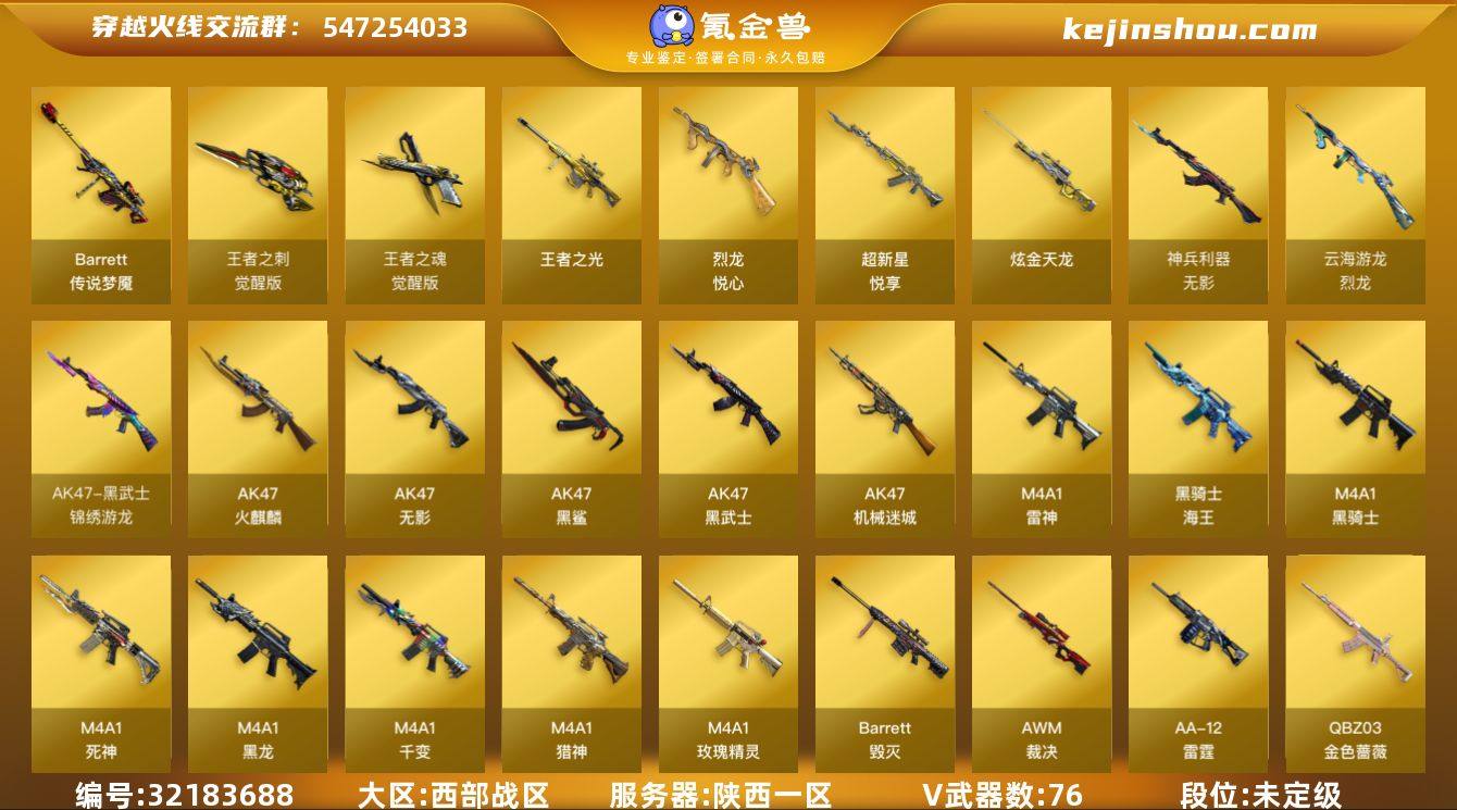陕西一区-80V-10王者-1炫金 【传说武器】:传说梦魇 【热门武器】:传说梦魇,QBZ03-金色蔷薇,Scar Light-白虎,M200-竞技荣光,死亡之眼*2,Kar98K-星神,M4A1-黑骑士,汤姆逊-烈龙*5,RPK-盘龙*2,加特林-炼狱*2,斯泰尔-蝴蝶,沙鹰-修罗*4 【王者炫金武器】:超新星-悦享,王者之光,烈龙-悦心,炫金天龙 【音效卡】:AWM-裁决音效卡,Barrett-碧霄极光音效卡,AWM-昌龙-怀旧音效卡 【皮肤】:裁决-胜者为王 皮肤,雷神-暗月,雷神-能量核心,雷神-化蛇 皮肤,火麒麟-平天大圣,火麒麟-心动糖果,毁灭-暗月,毁灭耀金皮肤,毁灭-直播专属,黑骑士-暗月*4,无影-暗月*2,无影-能量核心,死神-秘银,战神-紫绶金章皮肤,极光-能量核心*2,修罗-能量核心,天神-暗月,龙啸-蛇姬 皮肤,擎天-秘银 【角色】:葵,瞳,晴雅,战地猎狐,王者春,王者-魅影,奇洋探员,云海玲珑,暗夜-X,北极狐-X,初恋灵狐,风暴女,嘉年华灵狐,灵狐-花神,灵狐者-X,灵狐者-七夕宝贝,龙儿,龙儿-小淘气,麻雀,曼陀罗-礼服,萌儿,潘多拉-X,斯沃特-X,蜀雪,铁骑荣耀,维纳斯,樱-战斗天使 【人偶武器】:斯泰尔-蝴蝶,AWM-灵狐-15周年嘉年华*2,迷你深渊冰龙,迷你波特博士*3,迷你牛牛*2,迷你生化手雷,生化手雷-机甲核心 【暴走生化】:死亡之眼*2,超级对讲机 【挑战大师】:火狱乱世-超越Max,冰龙粉碎者-白马银枪,激光毁灭者III-白马银枪,KAC-圣炎切割者III,神圣爆裂者-末日III 【英雄级武器】:M4A1-千变,AK47-火麒麟*2,M4A1-黑龙,M4A1-雷神*2,M4A1-黑骑士,AK47-无影,M4A1-死神,AK47-黑武士,AK47-机械迷城,AK47-黑鲨,Scar Light-白虎,无影-神兵利器,黑武士-锦绣游龙,M4A1-玫瑰精灵,QBZ03-金色蔷薇,M4A1-猎神,王者之势-觉醒版,王者冰魄-觉醒版,黑骑士-海王,王者之烈-觉醒版,Barrett-毁灭*2,AWM-...