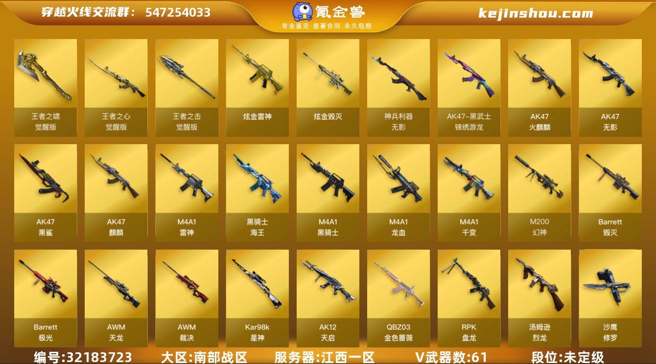 江西一区-62V-7王者-2炫金 【热门武器】:QBZ03-金色蔷薇,M200-幻神,死亡之眼,Kar98K-星神,C.A.T,炼狱-迷你小钢,M4A1-黑骑士*2,汤姆逊-烈龙*6,RPK-盘龙*6,斯泰尔-蝴蝶,羊驼玩偶,沙鹰-修罗*2 【王者炫金武器】:炫金雷神,炫金毁灭 【音效卡】:烈火-动感闪耀 音效卡,M4A1-雷神音效卡,M4A1-黑骑士音效卡,Barrett-毁灭音效卡 【皮肤】:雷神-耀金皮肤,火麒麟-平天大圣,火麒麟-心动糖果,毁灭-星空,毁灭-冠军之怒,毁灭-直播专属,M4A1-千变-孔明皮肤,黑骑士耀金皮肤,无影-能量核心,无影耀金皮肤,战神-粉色甜心皮肤,AK47-B-常胜将军-曹操,AK47-B-常胜将军-刘备,AK47-B-常胜将军-孙权,修罗-能量核心 【角色】:葵,王者-葵-貂蝉,乔伊教练,初恋灵狐,风暴女,嘉年华灵狐,零-水下丽影,潜龙队-X,邱刚敖,斯沃特-X,新灵狐者,海豹突击队 【人偶武器】:炼狱-迷你小钢,斯泰尔-蝴蝶,AWM-灵狐-15周年嘉年华,海滩汪汪-巴雷特,COP-旗袍,C.A.T,迷你深渊冰龙,夺魂,深渊终结者手雷,闪光弹-貂蝉,高爆手雷-大乔,COP-青花瓷-斯沃特精英,AK47-斯沃特,M200-夜玫瑰,灵狐娃娃手雷 【暴走生化】:死亡之眼,超级对讲机 【挑战大师】:冰龙粉碎者-白马银枪*3,激光毁灭者III-白马银枪*2,激光毁灭者III,神圣爆裂者-末日III 【英雄级武器】:M4A1-千变,AK47-火麒麟*2,AK47-麒麟,M4A1-雷神*2,M4A1-黑骑士*2,AK47-无影,AK12-天启,AK47-黑鲨,M4A1-龙血*2,无影-神兵利器,黑武士-锦绣游龙,QBZ03-金色蔷薇,烈火-动感闪耀,王者之心-觉醒版,王者之势-觉醒版,AK-47-猩红传说,黑骑士-海王,AK47-B-常胜将军,AWM-天龙,Barrett-毁灭,Barrett-极光,AWM-裁决,M200-幻神,Kar98K-星神,王者之光-觉醒版,RPK-盘龙*6,汤姆逊-烈龙*6,沙鹰-修罗*2,天神-动感