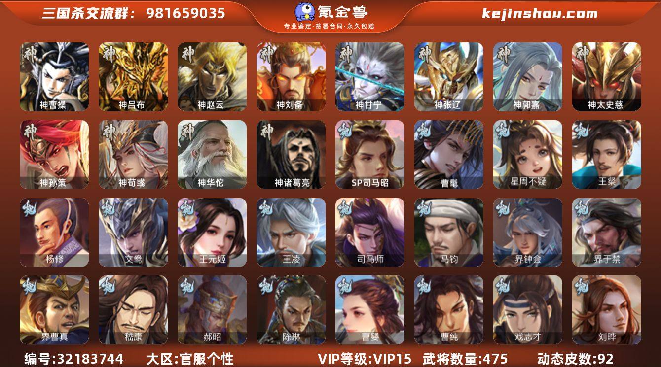 [16390519]标题:S35779 VIP等级:VIP15 官阶:大将军 史诗武将数量:90 动态皮肤数量:92 史诗宝珠数量:8 将魂数量:6041 雁翎数量:24777 心愿积分:15224 史诗武将(魏国):文鸯,曹髦,马钧,曹婴,王元姬,界钟会,戏志才,清河公主,SP司马昭,司马师,星周不疑,王凌,界曹真,嵇康,杨修,陈琳,刘晔,王粲,界于禁,程昱,曹纯,郝昭 史诗武将(蜀国):谋黄忠,谋孙尚香,谋赵云,谋夏侯氏,沙摩柯,关索,周群,花鬟,张星彩,王平,诸葛瞻,界黄忠,马云禄,董允,赵襄,谋马超 史诗武将(吴国):谋黄盖,界徐盛,留赞,骆统,张奋,谋陆逊,周处,界步练师,界朱然,吴景,贺齐,孙皓,文鸯,谋孙尚香 史诗武将(群雄):刘焉,十常侍,星董卓,谋貂蝉,杜预,杨彪,界左慈,祢衡,南华老仙,许攸,麹义,谋张角,裴秀,界李儒,星黄忠,界沮授,张让,司马徽,审配,王允,卑弥呼,左慈,兀突骨,沮授,陶谦,士燮,苏飞,陈登,公孙康 史诗武将(神将):神郭嘉,神荀彧,神甘宁,神曹操,神孙策,神华佗,神太史慈,神赵云,神吕布,神张辽,神刘备 其他亮点:欢乐豆51155