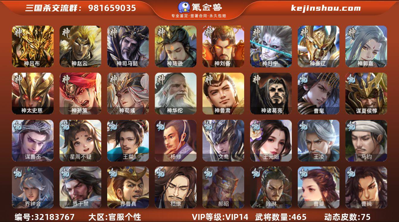[16489572]标题:S35833 官阶: 大将军 VIP等级: VIP14 史诗武将数量:92 动态皮肤数量:73 国战武将:95 史诗宝珠数量:95 将魂数量:624 雁翎数量:2979 心愿积分:10622 神将: 神甘宁,神郭嘉,神刘备,神陆逊,神吕布,神司马懿,神孙策,神太史慈,神荀彧,神张辽,神赵云,神鲁肃,神华佗 魏国武将: 刘晔,戏志才,曹纯,曹婴,陈琳,程昱,郝昭,嵇康,界曹真,界于禁,界钟会,马钧,魏-司马昭,王凌,王元姬,文鸯,杨修,王粲,星周不疑,谋曹丕,谋夏侯惇,曹髦,清河公主,势董昭 蜀国武将: 董允,花鬘,界黄忠,傅佥,谯周,沙摩柯,王平,张星彩,赵襄,诸葛瞻,谋马超,谋赵云,谋夏侯氏,马云騄,谋诸葛亮,谋关羽 吴国武将: 贺齐,界步练师,界徐盛,界朱然,留赞,骆统,孙寒华,孙皓,周处,文鸯,谋黄盖,谋陆逊,张奋,势太史慈 群国武将: 杜预,公孙康,界李儒,界左慈,沮授,南华老仙,麹义,审配,士燮,苏飞,陶谦,王允,兀突骨,星黄忠,许攸,杨彪,张琪瑛,张让,郑玄,左慈,界沮授,谋张角,裴秀,十常侍,SP甄姬,群-司马昭,星董卓 其他亮点:欢乐豆50453