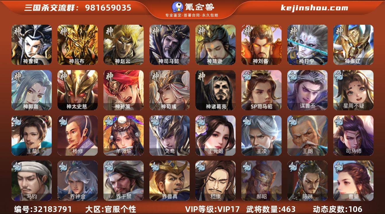 [15588471]标题:S35402 VIP等级: VIP17 官阶: 大将军 史诗武将数量:93 动态皮肤数量:106 国战武将:101 史诗宝珠数量:80 将魂数量:13182 雁翎数量:27705 心愿积分:14066 神将: 神曹操,神甘宁,神郭嘉,神刘备,神陆逊,神吕布,神司马懿,神孙策,神太史慈,神荀彧,神张辽,神赵云 魏国武将: 刘晔,戏志才,曹纯,曹婴,陈琳,程昱,郝昭,嵇康,界曹真,界于禁,界钟会,马钧,司马师,王朗,王凌,王元姬,文鸯,羊徽瑜,杨修,王粲,星周不疑,谋曹丕,清河公主,SP司马昭 蜀国武将: 鲍三娘,董允,关索,花鬘,界黄忠,谯周,沙摩柯,王平,张星彩,赵襄,周群,诸葛瞻,谋马超,谋黄忠,马云騄,谋关羽 吴国武将: 贺齐,界步练师,界徐盛,界朱然,留赞,骆统,孙寒华,孙皓,吴景,周处,文鸯 群国武将: 卑弥呼,陈登,杜预,公孙康,界李儒,界左慈,沮授,刘焉,祢衡,南华老仙,庞德公,麹义,审配,士燮,司马徽,苏飞,陶谦,王允,兀突骨,星甘宁,星黄忠,徐荣,许攸,杨彪,张琪瑛,张让,郑玄,左慈,裴秀,势于吉,谋吕布 其他亮点:欢乐豆68410,元宝37108