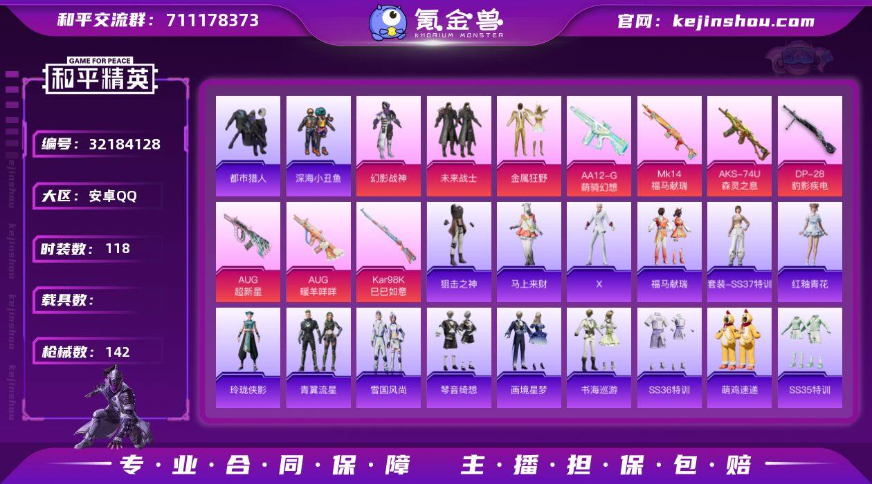 【0载具 7特效枪 4粉装 142枪皮 118套装】6王牌3卓越3传奇 都市猎人,浪漫天命 暗影哥特,深海小丑鱼,小丑鱼,梦幻火箭,金属狂野,AUG-超新星,AUG-暖羊咩咩,Kar98K-巳巳如意,Mk14-福马献瑞,AKS-74U-森灵之息,AA12-G-萌骑幻想,DP-28-豹影疾电 狂鲨锋刃飞行器,鸡智如我飞行器,梦幻火箭飞行器,云朵驼驼飞行器,异域银装飞行器,炫彩糖果飞行器,马上有福飞行器,编号:QNRNT60