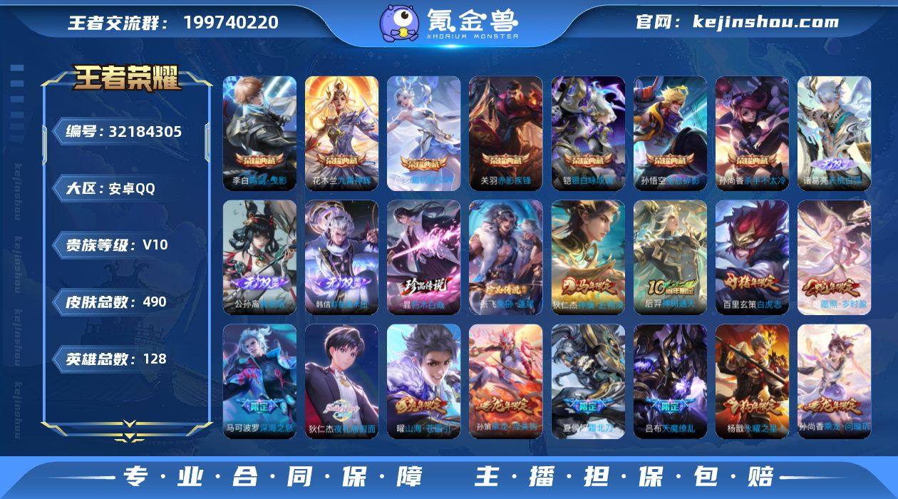 【mwz238】安卓Q-V10-最强王者段位-128英雄-490皮肤-7典藏皮肤-3无双-2珍品传说-53传说-149史诗 【英雄全皮】:孙权全皮,娜可露露全皮,橘右京全皮,钟馗全皮,鬼谷子全皮,百里玄策全皮,狂铁全皮,猪八戒全皮,敖隐全皮,蒙恬全皮,金蝉全皮,暃全皮,戈娅全皮,空空儿全皮,影全皮 【荣耀典藏】:孙悟空全息碎影,孙尚香杀手不太冷,李白鸣剑曳影,花木兰九霄神辉,关羽赤影疾锋,铠银白咏叹调,伽罗最初的交响 【无双皮肤】:诸葛亮天机白泽,公孙离离恨烟,韩信群星魔术团 【珍品传说】:暃朽木白哉,张飞兔狲蓬尾 【传说皮肤】:狄仁杰神骥赴朔漠,后羿神树通天,虞姬愿照岁时盈,裴擒虎祥瑞亨通,夏侯惇霜北刀,孙尚香乘龙问璇玑,孙策乘龙淬吴钩,赵云乘龙铭钟鼎,艾琳觅芳踪,狄仁杰夜礼服假面,王昭君永恒水手月亮,诸葛亮鹤羽星尊,公孙离记忆之芯,虞姬无限倾心,项羽无限倾心,伽罗炽翼辉光,孙悟空齐天大圣,曜山海苍雷引,吕布怒海麟威,李白诗剑行,狄仁杰神器狴犴令,百里守约碎云,橘右京枫霜尽,娜可露露前尘镜,孙尚香音你闪耀,马可波罗深海之息,后羿无尽星芒,马超无双飞将,孙策挚爱之约,孙策末日机甲,赵云淬星耀世,西施游龙清影,周瑜音你心动,兰陵王默契交锋,诸葛亮时雨天司,铠绛天战甲,镜炽阳神光,虞姬启明星使,曜云鹰飞将,李信一念神魔,刘备时之恋人,貂蝉猫影幻舞,干将莫邪久胜战神,达摩黄金狮子座,百里玄策白虎志,梦奇胖达荣荣,后羿黄金射手座,杨戬永曜之星,孙尚香末日机甲,宫本武藏地狱之眼,孙悟空地狱火,吕布天魔缭乱,狄仁杰超时空战士 【限定皮肤】:白起狰,公孙离离恨烟,夏侯惇霜北刀,暃埋骨钱,蔡文姬夏日便利店,虞姬夏日便利店,姜子牙天穹之誓,狄仁杰阴阳师,赵云皇家上将,墨子神迹守卫,嬴政优雅恋人,嬴政白昼王子,鲁班七号狮舞东方,庄周...