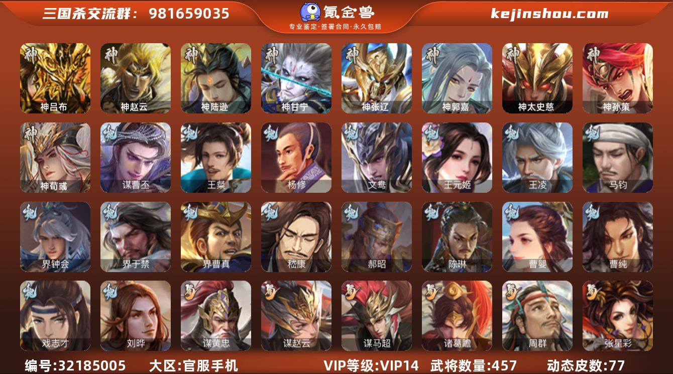 [16231609]标题:S35706 VIP等级:VIP14 官阶:大将军 史诗武将数量:78 动态皮肤数量:77 史诗宝珠数量:5 将魂数量:5132 雁翎数量:23723 心愿积分:17745 史诗武将(魏国):文鸯,谋曹丕,马钧,曹婴,王元姬,界钟会,戏志才,清河公主,王凌,界曹真,嵇康,杨修,陈琳,刘晔,王粲,界于禁,程昱,曹纯,郝昭 史诗武将(蜀国):势魏延,谋黄忠,谋赵云,傅佥,沙摩柯,周群,花鬟,谯周,张星彩,王平,诸葛瞻,界黄忠,马云禄,谋马超 史诗武将(吴国):谋黄盖,孙寒华,界徐盛,留赞,骆统,势太史慈,周处,界步练师,吴景,贺齐,文鸯,势陆郁生 史诗武将(群雄):刘焉,十常侍,徐荣,杜预,杨彪,界左慈,祢衡,南华老仙,许攸,刘璋,麹义,郑玄,皇甫嵩,裴秀,界李儒,星黄忠,张让,王允,左慈,兀突骨,沮授,陶谦,士燮,苏飞,公孙康 史诗武将(神将):神郭嘉,神荀彧,神甘宁,神孙策,神太史慈,神赵云,神陆逊,神吕布,神张辽 其他亮点:欢乐豆35706