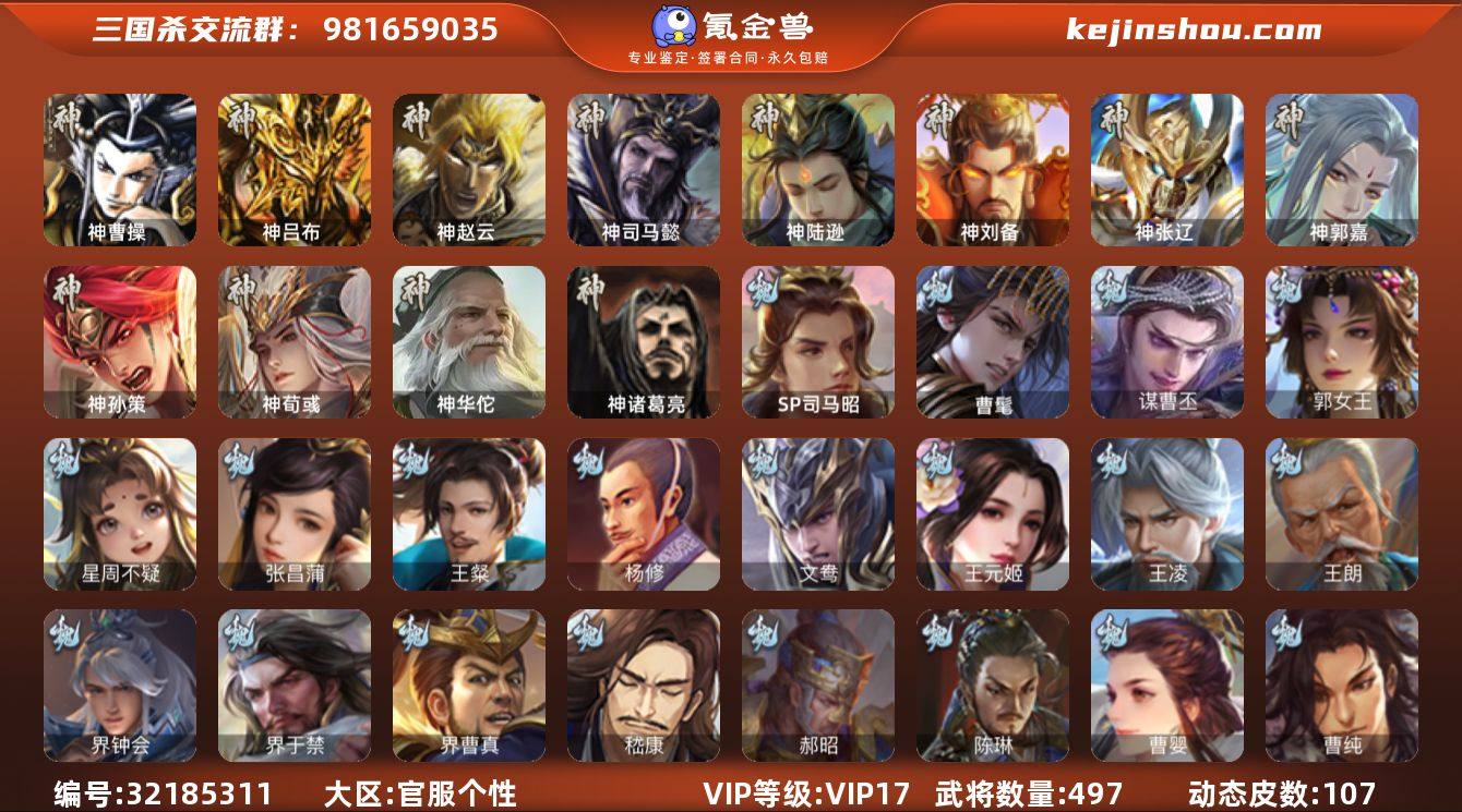[16626912]标题:S35886 VIP等级:VIP17 官阶:大将军 史诗武将数量:99 动态皮肤数量:107 史诗宝珠数量:0 将魂数量:28708 雁翎数量:29997 心愿积分:2395 史诗武将(魏国):文鸯,曹髦,谋曹丕,曹婴,王元姬,界钟会,戏志才,势辛宪英,清河公主,司马昭,张昌蒲,王朗,SP司马昭,郭女王,星周不疑,王凌,界曹真,嵇康,杨修,陈琳,刘晔,王粲,界于禁,程昱,曹纯,郝昭 史诗武将(蜀国):谋黄忠,谋关羽,谋诸葛亮,谋赵云,谋夏侯氏,沙摩柯,关索,周群,花鬟,谯周,张星彩,王平,诸葛瞻,界黄忠,马云禄,董允,赵襄,谋马超 史诗武将(吴国):孙寒华,界徐盛,留赞,骆统,势太史慈,谋陆逊,界步练师,界朱然,吴景,贺齐,孙皓,文鸯,势陆郁生 史诗武将(群雄):刘焉,星董卓,灵雎,徐荣,谋貂蝉,杜预,杨彪,界左慈,张琪瑛,祢衡,许攸,麹义,司马昭,谋张角,庞德公,星甘宁,郑玄,裴秀,界李儒,星黄忠,界沮授,张让,司马徽,审配,王允,卑弥呼,左慈,兀突骨,沮授,陶谦,士燮,苏飞,公孙康 史诗武将(神将):神郭嘉,神荀彧,神曹操,神孙策,神华佗,神赵云,神陆逊,神司马懿,神吕布,神张辽,神刘备 其他亮点:欢乐豆34356