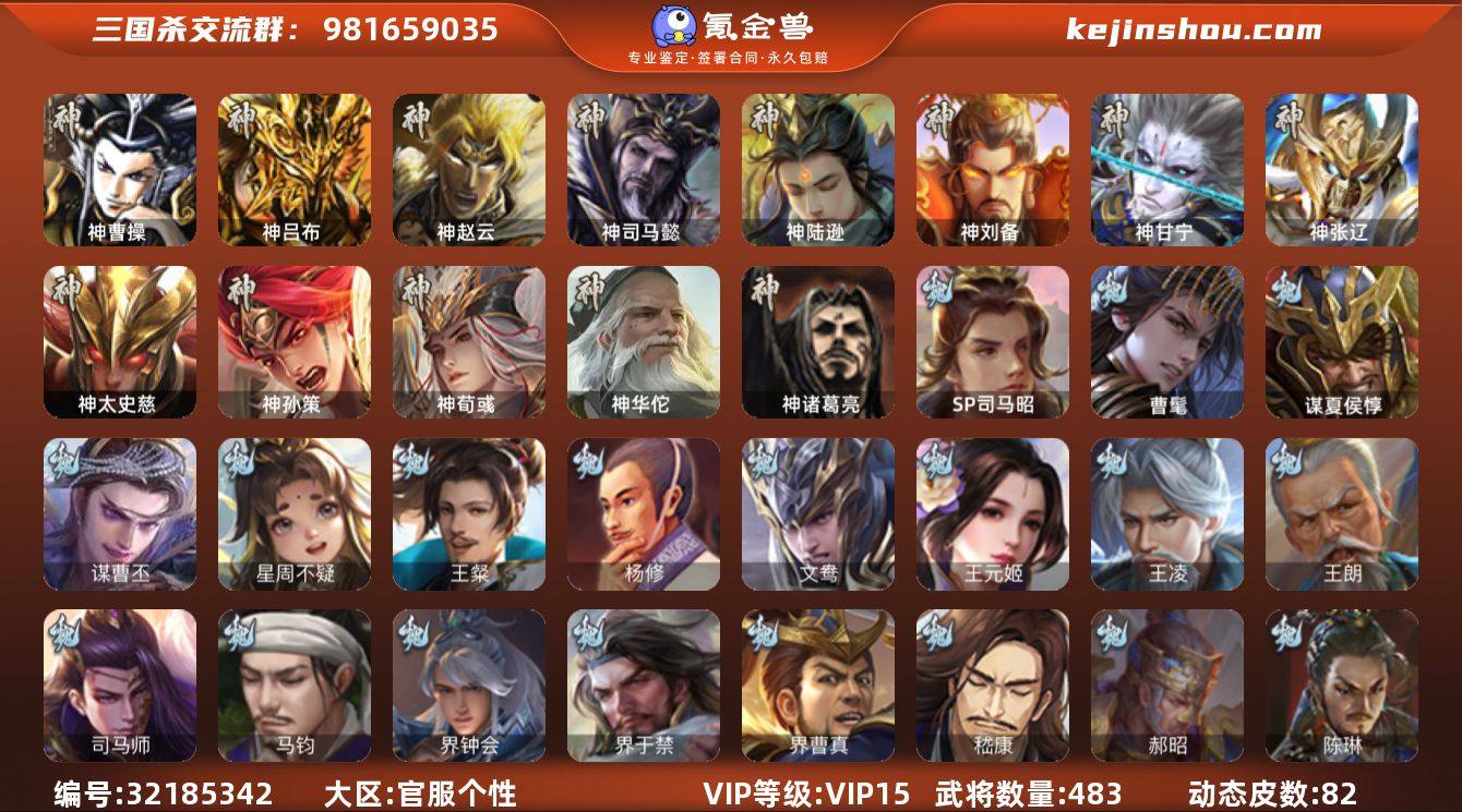 [16041766]标题:S35616 VIP等级:VIP15 官阶:大将军 史诗武将数量:96 动态皮肤数量:82 史诗宝珠数量:24 将魂数量:7110 雁翎数量:37235 心愿积分:10933 史诗武将(魏国):文鸯,曹髦,谋曹丕,马钧,曹婴,王元姬,界钟会,戏志才,清河公主,司马昭,王朗,SP司马昭,司马师,星周不疑,谋夏侯惇,王凌,界曹真,嵇康,杨修,陈琳,刘晔,王粲,界于禁,程昱,曹纯,郝昭 史诗武将(蜀国):势魏延,谋关羽,谋诸葛亮,谋赵云,沙摩柯,关索,周群,花鬟,谯周,张星彩,王平,诸葛瞻,界黄忠,马云禄,董允,赵襄,谋马超 史诗武将(吴国):谋黄盖,孙寒华,界徐盛,留赞,骆统,势太史慈,张奋,谋陆逊,谋孙权,周处,界步练师,界朱然,吴景,贺齐,孙皓,文鸯,势陆郁生 史诗武将(群雄):友诸葛亮,势于吉,杜预,界左慈,张琪瑛,祢衡,南华老仙,许攸,麹义,司马昭,庞德公,星甘宁,郑玄,界李儒,界沮授,张让,司马徽,王允,卑弥呼,左慈,兀突骨,沮授,陶谦,士燮,苏飞,公孙康 史诗武将(神将):神荀彧,神甘宁,神曹操,神孙策,神华佗,神太史慈,神赵云,神陆逊,神司马懿,神吕布,神张辽,神刘备