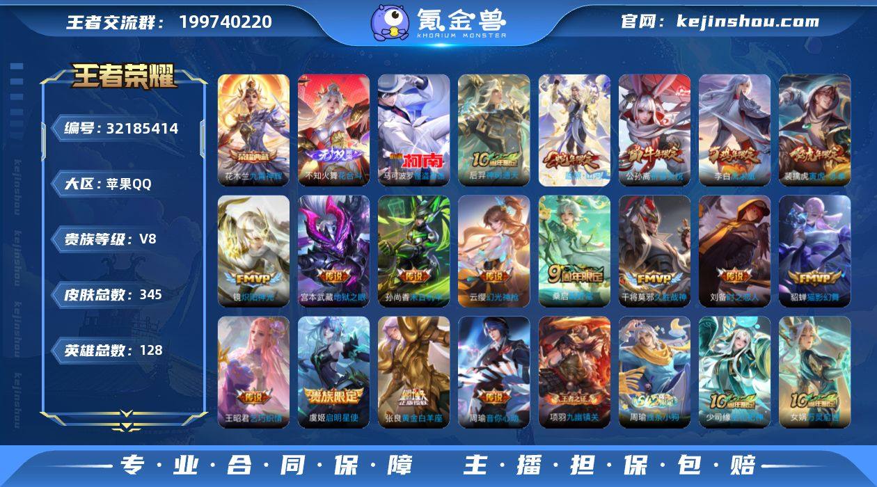 实名: 可修改 贵族等级: V8 英雄数: 128 皮肤数: 345 荣耀水晶: 九霄神辉 无双皮: 花合斗 珍品传说: 怪盗基德 传说皮: 黄金白羊座,猫影幻舞,久胜战神,炽阳神光,末日机甲-孙尚香,地狱之眼,音你心动-周瑜,乞巧织情,时之恋人-刘备,幻光神枪,神树通天 限定皮: 李小龙,祈雪灵祝,梁祝,凤求凰,青龙志,凤凰于飞,至尊宝,大圣娶亲,寅虎·赤拳,鸣野蒿,逐霄战戟,愿照·山河定