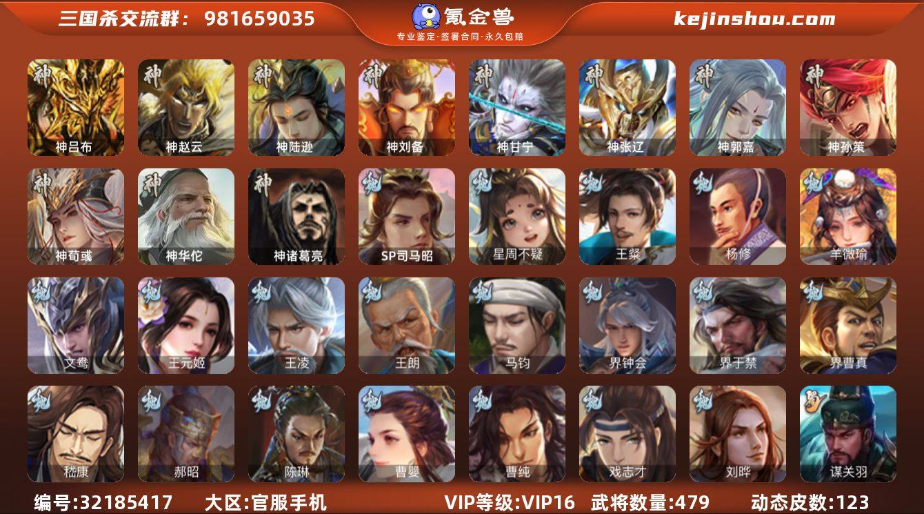 [15408304]标题:S35275 VIP等级:VIP16 官阶:大将军 史诗武将数量:95 动态皮肤数量:123 史诗宝珠数量:0 将魂数量:2654 雁翎数量:23157 心愿积分:1281 史诗武将(魏国):文鸯,马钧,曹婴,王元姬,界钟会,戏志才,羊徽瑜,司马昭,势董昭,王朗,SP司马昭,星周不疑,蒋干,王凌,界曹真,嵇康,杨修,陈琳,刘晔,王粲,界于禁,程昱,曹纯,郝昭 史诗武将(蜀国):谋黄忠,谋关羽,谋诸葛亮,鲍三娘,谋赵云,沙摩柯,关索,周群,花鬟,谯周,张星彩,王平,诸葛瞻,界黄忠,马云禄,董允,赵襄,谋马超 史诗武将(吴国):谋黄盖,孙寒华,界徐盛,留赞,骆统,势太史慈,周处,界步练师,界朱然,吴景,贺齐,孙皓,文鸯 史诗武将(群雄):刘焉,十常侍,徐荣,谋貂蝉,杜预,界左慈,张琪瑛,祢衡,南华老仙,许攸,麹义,司马昭,谋张角,庞德公,星甘宁,郑玄,裴秀,界李儒,星黄忠,界沮授,张让,司马徽,审配,王允,卑弥呼,左慈,兀突骨,沮授,陶谦,士燮,苏飞,公孙康 史诗武将(神将):神郭嘉,神荀彧,神甘宁,神孙策,神华佗,神赵云,神陆逊,神吕布,神张辽,神刘备