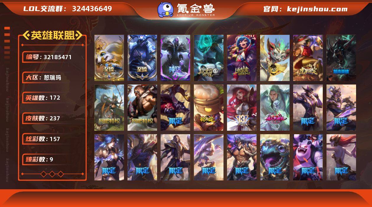 未定级段位-172英雄-237皮肤-157炫彩-0终极-8神话-28限定-25传说-54史诗 【神话皮肤】:十周年纪念安妮,源代码乐芙兰,神凰行者瑞羽圣凰艾尼维亚,灰烬骑士派克,至臻DRX亚托克斯,至臻绒毛菲兹 【至臻皮肤】:至臻暗裔英雄嘉文四世,至臻绒毛菲兹,至臻DRX亚托克斯,至臻T1塞拉斯 【臻彩皮肤】:无畏骑士瑟庄妮赤子初心,冠军之血希瓦娜凯旋圣装,冠军之隐劫凯旋圣装,星之守护者卡莎热情之光,破败军团厄运小姐灵岛征伐使,可爱可爱粉红红布里茨,春晖神女艾希玉露金风,魔女阿卡丽虚荣 【年限皮肤】:龙腾虎跃瑟提,天龙之子斯莫德,点心宝贝阿木木 【情人节限定】:水晶玫瑰斯维因 【冰雪限定】:幸福女神乐芙兰,圣诞精灵崔丝塔娜,圣诞捣蛋鬼金克丝 【限定皮肤】:暗杀星努努和威朗普,SKTT1娜美,FPX锤石,EDG厄斐琉斯,女帝厄运小姐,暗裔英雄盖伦,胜利之剑亚托克斯,胜利枪神卢锡安,胜利凤凰艾尼维亚,胜利之王泰达米尔,胜利巨口克格莫,胜利女神娑娜,胜利剑圣易,胜利之运崔斯特,胜利女神菲奥娜,灵魂收割者索拉卡,暗影沃里克,野兽猎人德莱文,野兽猎人瑟庄妮,都铎王朝图奇 【传说皮肤】:战地机甲厄加特,大天使长米迦勒凯尔,恶魔男爵瑞兹,日蚀骑士希维尔,提莫约德尔人的一大步,女皇艾希,恶魔之刃泰达米尔,鬼魂新娘莫甘娜,黯晶凤凰艾尼维亚,冰霜之刃艾瑞莉娅,丧尸布兰德,第三类接触黑默丁格,星之守护者阿卡丽,西部魔影大小姐蕾欧娜,黎明使者锐雯,苍穹之光韦鲁斯,宇航员诺提勒斯,金牌主播德莱文,灌篮高手德莱厄斯,青花瓷奥瑞利安索尔,暗星尊烬,西部天使赛娜,西部魔影卢锡安,天煞劫,真实伤害艾克 【史诗皮肤】:科学怪熊的新娘安妮,圣光审判凯尔,侍魂易,战场公主希维尔,钢铁之心希维尔,月光女神阿忒弥斯索拉卡,兔宝宝提莫,熊猫提莫,火箭达人崔丝塔娜,法国皇室...