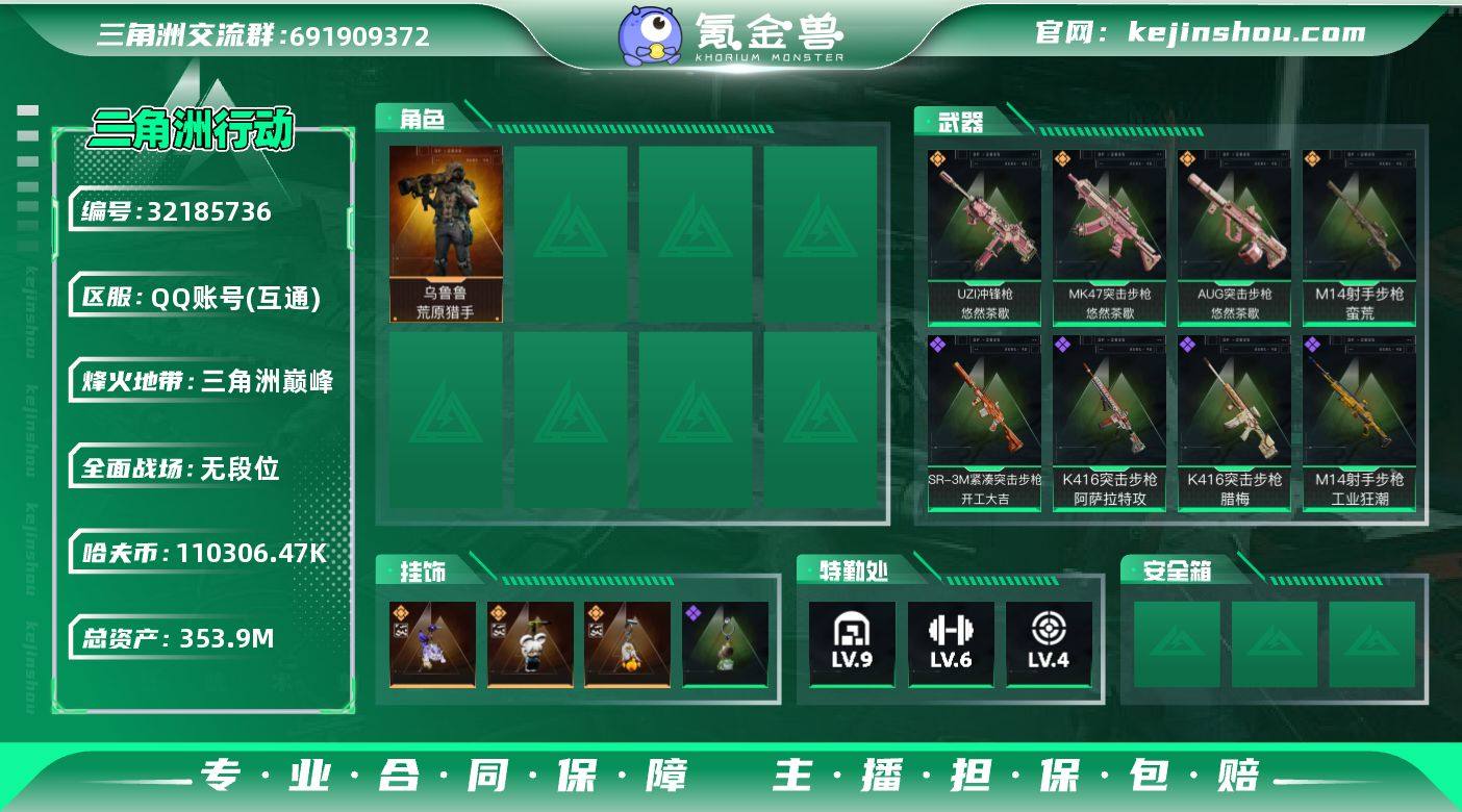 实名:不可二次实名 总资产:353.9M 哈夫币:110306.47K 烽火地带段位:三角洲巅峰 烽火地带等级:60 全面战场段位:无段位 全面战场等级:1 9级仓库,6级训练中心,4级靶场,5级指挥中心,3级潜水中心,3级防具台,3级工作台,3级制药台,3级技术中心,1级收藏室 战术部门等级:3 战斗部门等级:2 医疗部门等级:2 研发部门等级:1 后勤部门等级:1 曼德尔砖-气象感应:0 曼德尔砖-命运王牌:0 曼德尔砖-电玩高手:0 曼德尔砖-美杜莎:0