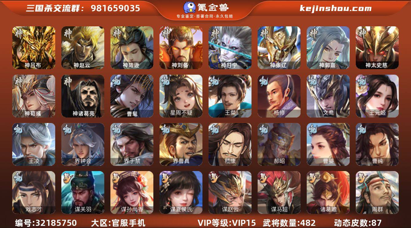 [16704467]标题:S35938 VIP等级:VIP15 官阶:大将军 史诗武将数量:85 动态皮肤数量:87 史诗宝珠数量:8 将魂数量:16494 雁翎数量:45911 心愿积分:23575 史诗武将(魏国):文鸯,曹髦,曹婴,王元姬,界钟会,戏志才,崔芙,势国渊,势辛宪英,清河公主,星周不疑,王凌,界曹真,嵇康,杨修,王粲,界于禁,程昱,曹纯,郝昭 史诗武将(蜀国):势魏延,谋关羽,谋孙尚香,鲍三娘,谋赵云,谋夏侯氏,关索,周群,花鬟,谯周,张星彩,王平,诸葛瞻,界黄忠,马云禄,赵襄,谋马超 史诗武将(吴国):孙寒华,界徐盛,留赞,骆统,势太史慈,周处,界步练师,界朱然,吴景,贺齐,孙皓,文鸯,谋孙尚香,势陆郁生 史诗武将(群雄):刘焉,十常侍,星董卓,徐荣,界左慈,张琪瑛,祢衡,南华老仙,许攸,刘璋,麹义,庞德公,张仲景,星甘宁,郑玄,裴秀,界李儒,星黄忠,张让,审配,卑弥呼,左慈,兀突骨,沮授,士燮,苏飞,公孙康 史诗武将(神将):神郭嘉,神荀彧,神甘宁,神太史慈,神赵云,神陆逊,神吕布,神张辽,神刘备 其他亮点:有年卡
