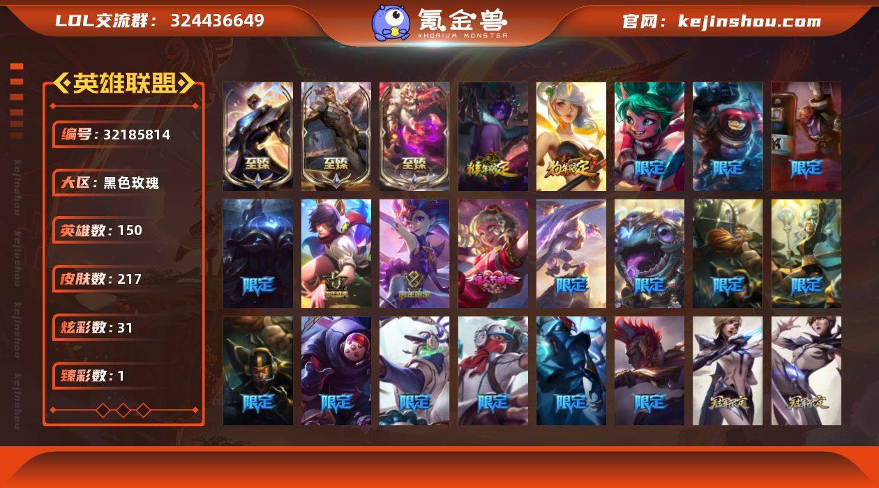 【LOLF2794】150英雄/217皮肤/4神话/35限定/1臻彩/31炫彩/20传说/48史诗/未定级/10周年庆典 凤凰/至臻 神龙尊者均衡之龙 沃利贝尔/至臻 未来战士 锤石/至臻 源计划:逆流 塞拉斯/征服者 韦鲁斯 炫金/紫金罗刹 莫甘娜/春晖神女 拉克丝/甜心宝贝 安妮/圣诞狂欢 时光/“主人不要我了” 阿木木/夺命美人 卡特/雪默丁格/雪装 奈德丽/冰雪女神 辛德拉/冠军之隐 劫/S1FNC 酒桶/S1FNC 迦娜/S1FNC 嘉文四世/S3 SKT T1 贾克斯/S4 SSW 炼金/S4 SSW 锤石/S5 SKT T1 阿兹尔/S6 SKT T1 艾克/S8 IG 菲奥娜/S8 IG 卡密尔/5周年 阿狸/玉剑传说无影/8周年 佐伊/胜利凤凰 艾尼维亚/胜利巨口 克格莫/南瓜头 费德提克/死亡誓约 卡特琳娜/鬼影森森 茂凯/无头骑士 赫卡里姆/死亡誓约 劫/泳池派对 黑默丁格/泳池派对 雷克顿/波比的巧克力工坊/防暴机器人 布里茨/防暴士兵 辛吉德/战地机甲 厄加特/大天使长米迦勒 凯尔/战场女武神 凯尔/女皇 艾希/至尊魔女 莫甘娜/冰霜之刃 艾瑞莉娅/女主播 迦娜/女警狙击 凯特琳/苹果机器人 布里茨/神龙尊者 圣龙李青/青花瓷 伊泽瑞尔/黎明使者 锐雯/光明哨兵 格雷福斯/符文战熊 沃利贝尔/泳池派对 吉格斯/神王 德莱厄斯/蔷薇绅士 杰斯/奥德赛 凯隐/黑夜使者 亚索/灵魂莲华 瑟提/科学怪熊的新娘 安妮/侍魂 易/地狱火 阿利斯塔/源代码 索拉卡/熊猫 提莫/荒野豺狼 沃里克/紫晶射手 艾希/少林武僧 贾克斯/刀锋女王 莫甘娜/卡尔萨斯·祸害之光/殇之机器人 阿木木/熔火之心 拉莫斯/飞越疯人院 萨科/武动巅峰 萨科/寒冰女皇 迦娜/血石诅咒 塔里克/穿着正装的恶魔 维迦/绝代智将 斯维因/抵抗军天使 凯特琳/黑曜石守护者 墨菲特/无畏号 墨菲特/海贼魅影 卡特琳娜/暗夜猫女 卡特琳娜/死亡绽放 伊莉丝/三昧真火 孙悟空/深海妖姬 卡西奥佩娅/生化博士 黑默丁格/铁血猎手 奈德丽/死亡领主 莫德凯撒/刺客信条 凯南/刺客信条...