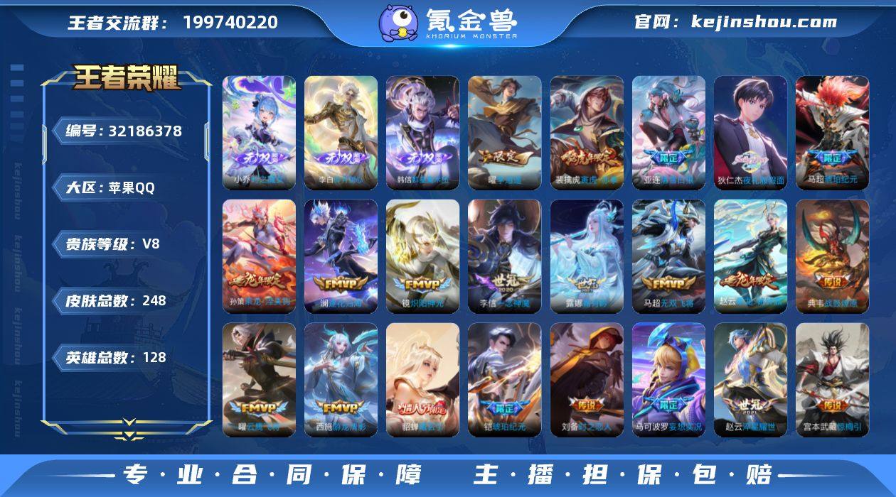 【精品无双号·金标曜·金标赵云·准全套龙年限定·群星魔术团·时之魔女·碎月剑心·落雪白狼·貂蝉曦玄引·乘龙淬吴钩·马超琥珀纪元·夜礼服假面·惊梅引·马可波罗妄想实况·寅虎赤拳·李逍遥·炽阳神光·一念神魔·霜月吟·一生所爱·幽恒·辉光之辰·白晶晶·浮光幕影·可二次】YXw18134-苹果Q-128英雄-248皮肤-13王者印记-180铭文-贵族积分5w【贵族8】【3无双·25传说·1天幕·7按键·293幸运值】【因赛季更新游戏段付以上号为准!】 【英雄全皮】:影全皮 【无双皮肤】:韩信群星魔术团,小乔时之魔女,李白碎月剑心 【金标】:金标曜,金标赵云 【天幕】:共赏芳华天幕 【内测皮肤】:孙尚香蔷薇恋人,狂铁特工战影 【传说皮肤】:亚连落雪白狼,貂蝉曦玄引,典韦战鼓燎原,孙策乘龙淬吴钩,赵云乘龙铭钟鼎,马超琥珀纪元,铠琥珀纪元,澜逐花归海,露娜霜月吟,狄仁杰夜礼服假面,宫本武藏惊梅引,马可波罗妄想实况,马超无双飞将,裴擒虎寅虎赤拳,赵云淬星耀世,西施游龙清影,曜李逍遥 ,周瑜音你心动,李元芳飞鸢探春,镜炽阳神光,虞姬启明星使,曜云鹰飞将,李信一念神魔,刘备时之恋人,虞姬云霓雀翎 【限定皮肤】:杨戬破阵退雄兵,狄仁杰阴阳师,赵云皇家上将,孙尚香蔷薇恋人,庄周高山流水,芈月白晶晶,吕布猎兽之王,元歌无心,甄姬幽恒,马可波罗妄想实况,狄仁杰魔术师,达摩沙漠行僧,项羽海滩派对,老夫子航海奇遇记,露娜一生所爱,兰陵王金庭之子,孙悟空孙行者,后羿辉光之辰,后羿如梦令,李元芳匿光侦查者,李元芳云中旅人,虞姬启明星使,干将莫邪冰霜恋舞曲,雅典娜黎明之约,太乙真人华丽摇滚,鬼谷子五谷丰年,黄忠烈魂,苏烈千军破阵,百里玄策原初追逐者,梦奇顽趣,沈梦溪大漠名商,裴擒虎寅虎赤拳,云中君纤云弄巧,嫦娥拒霜思,曜李逍遥 ,鲁班大师探海日志,桑启海盐诗旅,艾琳流音漫舞,司空震地狱...