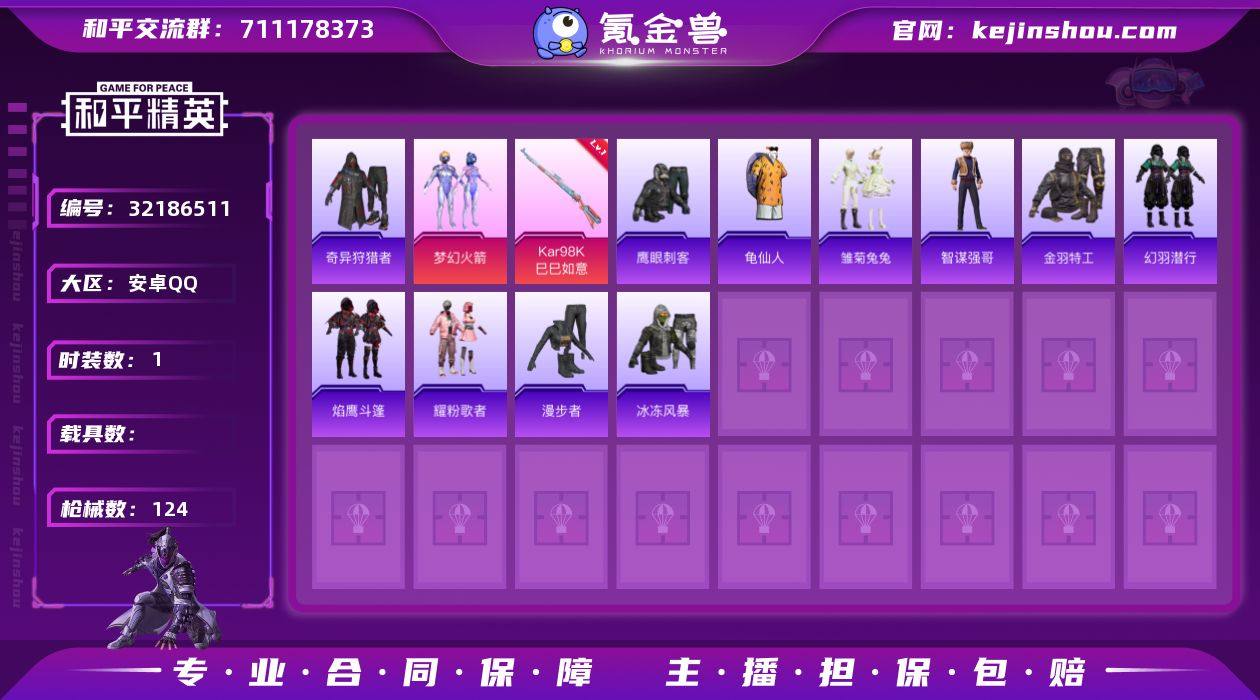 DSH2340【身法号1粉 3特 金羽特工 奇异狩猎者 梦幻火箭】安卓手Q-1粉装-3特效枪-95套装-124枪皮-1王牌印记-不朽星钻Ⅱ-35364热力值【1粉装】梦幻火箭【3特效枪】Mk14-福马献瑞[5级],Kar98K-巳巳如意[5级],DP-28-豹影疾电[5级]【1稀有】奇异狩猎者【5飞行器】马上有福飞行器,异域银装飞行器,光之冒险尾迹,空岛之星尾迹,梦幻火箭飞行器【1头盔】幻影战神头盔【1背包】梦幻火箭背包【214其它衣服和枪皮】猎鹰,青年教官,SS22特训,SS24特训,云魄琉璃,冷焰舞者,鹰眼刺客,牛气冲天,橘黑制服,空岛之星,黎明保卫者,幻世战舞者,玩偶服-菲菲,白色伏地魔,老实芭蕉,长空猛禽,绮丽涂鸦,幻影武者,绯格组合,圣诞惊喜,SS27特训,福马献瑞,竞技达人朋克,薄荷星砂,漫步者,柠萌假日,幻羽潜行,顶瓜瓜,酒红色名流,春光漫游,SS20特训,SS21特训,战术大师,玉兔迎春,SS25特训,SS19特训,SS31特训,SS28特训,SS29特训,娇憨猪猪,青翼流星,SS36特训,萝兰蝴蝶,蝶变,霓虹街区,马上来财,SS14特训,金羽特工,青涩时光,萌趣咩咩,海盐绵绵冰,牛气满满,惊鸿侠骨,龟仙人,海岛探路者,耀粉歌者,完美偶像,竞技角斗士,涂山之恋,精神漫游,魅力单车,王牌教练,黑色伏地魔,蓝色运动,快闪甜心,红色运动,街头潮人,竞技名士,冰冻风暴,麻辣教官,SS23特训,巳巳如意,焰鹰斗篷,森林游猎者,探宝勇士,龙的传人,雏菊兔兔,疯狂小兔子,龙魂突击队,白糯汤圆,狙击之神,智谋强哥,黄色运动,锦衣飞扬,湖蓝色名流,角色-乐音,特训学院,黄色伏地魔,猛禽,SS26特训,SS37特训,酷萌兔限定,冰川特警,AKM-破晓战魂,M416-圣诞惊喜,M200-惊鸿侠骨,AUG-紫晶流影,莫辛纳甘-乌木金纹,Mk14-冰河战士,汤姆逊-环太平洋,M16A4-冰河战士,平底锅-空岛之星,P90-巳巳如意,沙漠之鹰-快闪甜心,AUG-异域银装,S686-红色方程式,M416-蓝色火焰,平底锅-娇憨猪猪,M16A4-幻世战舞者,AKM-