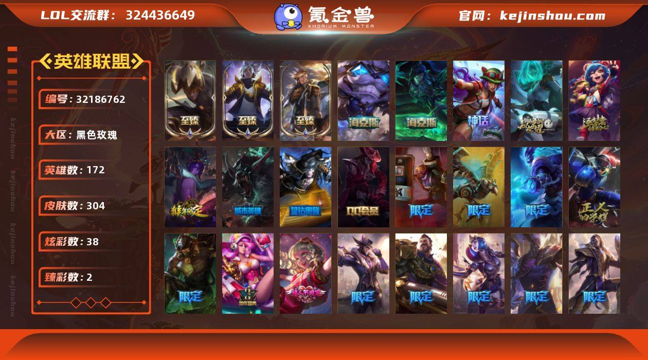 单双黄金段位-172英雄-304皮肤-38炫彩-0终极-9神话-38限定-29传说-76史诗 【神话皮肤】:十周年纪念安妮,源代码乐芙兰,十五周年纪念希维尔,神凰行者瑞羽圣凰艾尼维亚,海克斯科技吉格斯,摄魂使者薇恩,至臻真实伤害亚索,至臻黑夜使者李青,至臻灵能特工伊泽瑞尔 【至臻皮肤】:至臻黑夜使者李青,至臻灵能特工伊泽瑞尔,至臻真实伤害亚索 【臻彩皮肤】:魔女阿卡丽虚荣,净雪之月莫甘娜冬虹 【年限皮肤】:碧玉之牙卡西奥佩娅,紫金罗刹莫甘娜 【海克斯皮肤】:摄魂使者薇恩,海克斯科技吉格斯 【情人节限定】:甜心宝贝安妮,觅心之翼奎因 【冰雪限定】:幸福女神乐芙兰,冬境仙灵索拉卡,圣诞开心鬼提莫,阿木木“主人不要我了”,平安夜女神娑娜,邪恶圣诞老人维迦,圣诞玩偶波比,圣诞老人布隆,冰雪女神辛德拉 【限定皮肤】:生化领主泰达米尔,冠军典狱长锤石,暗杀星蒙多,暗杀星努努和威朗普,暗杀星慎,SSW辛吉德,SSW锤石,SKTT1雷克顿,电玩女神厄运小姐,暗裔英雄盖伦,胜利枪神格雷福斯,胜利女神奥莉安娜,胜利之剑亚托克斯,胜利枪神卢锡安,胜利之运崔斯特,胜利女神菲奥娜,无头骑士赫卡里姆,魅惑女巫厄运小姐,蓝色忧郁崔斯特,暗影沃里克,钢铁之翼艾尼维亚,红桃杰克崔斯特,防暴士兵辛吉德,防暴天使凯尔 【传说皮肤】:铁哥们儿奥拉夫,血石领主弗拉基米尔,大天使长米迦勒凯尔,战场女武神凯尔,源计划林易,恶魔男爵瑞兹,黎明使者索拉卡,烈焰雄心崔丝塔娜,绅士科加斯,双重冰晶艾尼维亚,电玩女神娑娜,女主播迦娜,最终BOSS维迦,未来战士凯特琳,冰川巨兽墨菲特,地狱行者孙悟空,银河魔装机神兰博,第三类接触黑默丁格,腥红之月鬼武姬阿卡丽,钢铁军团盖伦,黯黑魔龙希瓦娜,星之守护者阿狸,符文战熊沃利贝尔,宇航员诺提勒斯,金牌主播德莱文,霸天异形卡兹克,灌篮高手德莱...