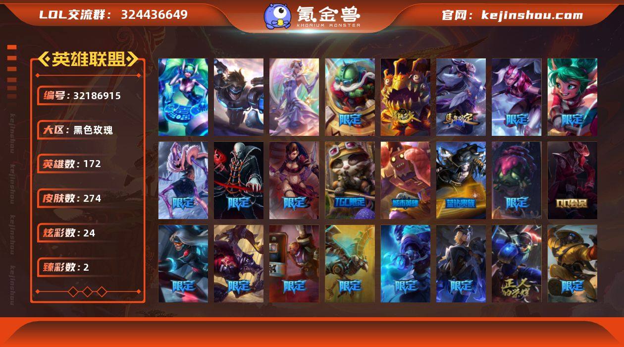 【LOLYH1643】172英雄/274皮肤/3终极/54限定/2臻彩/24炫彩/22传说/83史诗/黄金/玉剑传说 无极 麒麟/霸天巨兽·雪崩 墨菲特/醒狮 克格莫/广寒仙子 嫦娥/幸福女神 乐芙兰/圣诞开心鬼 提莫/圣诞狂欢 努努/圣诞糖果棒 厄运小姐/“主人不要我了” 阿木木/胡桃夹子 小丑/英勇玩具兵船长/冬季仙境 卡尔玛/邪恶圣诞老人 维迦/冰雪节 茂凯/雪默丁格/圣诞玩偶 波比/圣诞驯鹿 克格莫/魄罗骑士 瑟庄妮/圣诞老人 布隆/冰雪节 炼金/冰雪节 格雷福斯/冰雪女神 辛德拉/冰雪兽 纳尔/大元素使/DJ-娑娜/未来战士/卧虎藏龙 贾克斯/诺斯费拉图 弗拉基米尔/冠军典狱长 锤石/冠军之血 希瓦娜/S2 暗杀星 蒙多/S2 暗杀星 努努/S2 暗杀星 慎/S3 SKT T1 贾克斯/S3 SKT T1 婕拉/S4 SSW 雷恩加尔/4周年 锐雯/胜利剑圣 易/海贼 瑞兹/南瓜头 费德提克/鬼影森森 茂凯/无头骑士 赫卡里姆/魅惑女巫 奈德丽/糖果使徒 费德提克/蓝色忧郁 崔斯特/蒙多蒙多/密林猎手 提莫/女猎手 希维尔/外星装甲 库奇/波比的巧克力工坊/创战纪 希维尔/勇者 奈德丽/都铎王朝 图奇/钢铁之翼 艾尼维亚/红桃杰克 崔斯特/防暴士兵 辛吉德/防暴天使 凯尔/惊悚派对 阿木木/血石领主 弗拉基米尔/源计划:林 易/欧米伽小队 幽灵特工/合金巨兽 努努和威朗普/鬼魂新娘 莫甘娜/冰霜之刃 艾瑞莉娅/红色男爵 库奇/最终BOSS 维迦/陆地王者4WD 布里茨/苹果机器人 布里茨/女帝 卡特琳娜/源计划:净化 薇恩/银河魔装机神 兰博/第三类接触 黑默丁格/炼狱魔犬 内瑟斯/死亡骑士 盖伦/钢铁军团 盖伦/苍穹之光 韦鲁斯/宇航员 诺提勒斯/女校长 菲奥娜/灌篮高手 德莱厄斯/暗星 锤石/绞肉机角斗士 赵信/铁钩船长 费德提克/重生之沙 费德提克/圣光审判 凯尔/战争机器 赛恩/月光女神阿忒弥斯 索拉卡/圣洁化身 索拉卡/源代码 索拉卡/荒野豺狼 沃里克/法国皇室 厄运小姐/黑帮狂花 厄运小姐/国王 泰达米尔/...