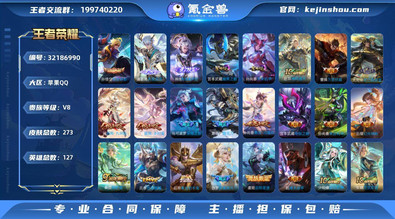 实名: 可修改 贵族等级: V8 英雄数: 127 皮肤数: 273 荣耀水晶: 全息碎影 无双皮: 韩信群星魔术团,天机白泽 星传说: 未来机甲,幽冥之眼 传说皮: 黄金射手座,绛天战甲,末日机甲-孙尚香,地狱之眼,炽翼辉光,乘龙·问璇玑,幻光神枪,死亡执政官,万灵伏威,神树通天 限定皮: 梁祝,御风骁将,辉光之辰,白晶晶,岱宗,冰霜恋舞曲,至尊宝,高山流水,猪悟能,深海之息,五谷丰年,怒海麟威,夏侯惇霜北刀,鸣野蒿,愿照·岁时盈,愿照·九州拓