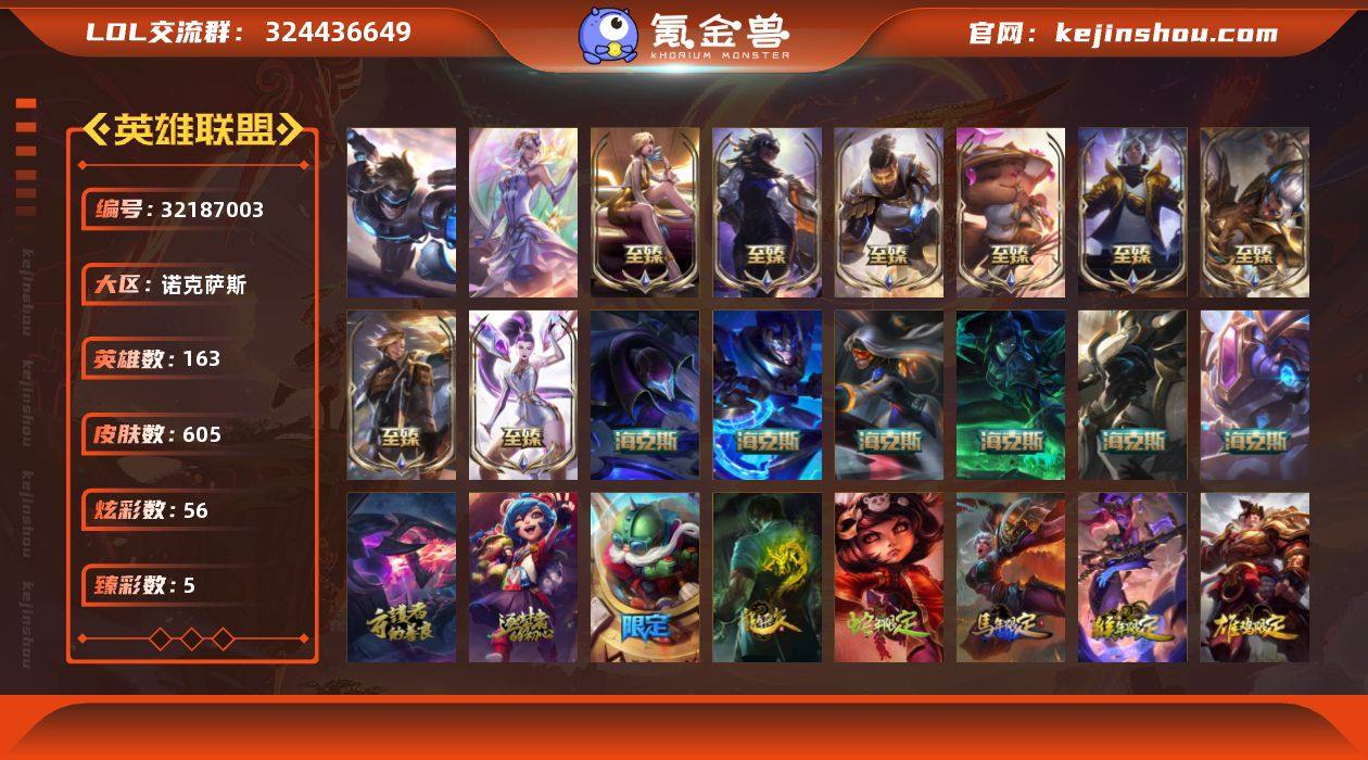 【LOLYH1640】163英雄/605皮肤/2终极/16神话/125限定/5臻彩/56炫彩/50传说/151史诗/未定级/10周年 安妮/暗星 科加斯/海克斯 嘉文四世/海克斯 克格莫/海克斯 魔腾/海克斯 人马/摄魂 薇恩/海克斯 希维尔/至臻 真实伤害 赛娜/至臻 真实伤害 亚索/至臻 K/DA ALL OUT卡莎/至臻 K/DA 伊芙琳/至臻 灵魂莲华 提莫/至臻 灵能特工 伊泽瑞尔/至臻 神龙尊者 炎龙瑟提/至臻 未来战士 卢锡安/飞龙在天/冠军之箭 艾希 凯旋圣装/冠军掠夺者 卡兹克 凯旋圣装/泳池派对 奥莉安娜 优雅珠光鲸/灵魂莲华 亚索 霜见之时/龙的传人 李青/龙年 孙悟空/“你看见过我的熊猫吗?” 安妮/替父从军 花木兰/玉净夜叉 凯特琳/张辽 文远/虎痴之拳 蔚/北辰之威 内瑟斯/春晖神女 拉克丝/金猪烈焰 瑟庄妮/烈焰美人 薇恩/甜心宝贝 安妮/觅心女王 寒冰/幸福女神 乐芙兰/圣诞开心鬼 提莫/圣诞精灵 崔丝塔娜/圣诞狂欢 努努/圣诞糖果棒 厄运小姐/圣诞狂欢 时光/狂心冰王 图奇/“主人不要我了” 阿木木/胡桃夹子 小丑/平安夜女神 娑娜/英勇玩具兵船长/邪恶圣诞老人 维迦/夺命美人 卡特/冰雪节 茂凯/雪默丁格/雪装 奈德丽/圣诞玩偶 波比/圣诞老人 酒桶/圣诞驯鹿 克格莫/魄罗骑士 瑟庄妮/雪球也能爆炸 吉格斯/冰雪节 炼金/冰雪节 马尔扎哈/冰雪女神 辛德拉/冰雪兽 纳尔/大元素使/未来战士/生化领主 泰达米尔/卧虎藏龙 贾克斯/舞会公主安妮/诺斯费拉图 弗拉基米尔/养蜂人 辛吉德/穿星魔锋 赵信/冠军之刃 锐雯/冠军典狱长 锤石/冠军之血 希瓦娜/冠军之矛 卡莉丝塔/冠军之隐 劫/冠军掠夺者 卡兹克/S1FNC 酒桶/S1FNC 迦娜/S1FNC 嘉文四世/S1FNC 卡尔萨斯/S1FNC 库奇/S2 暗杀星 蒙多/S2 暗杀星 努努/S2 暗杀星 慎/S3 SKT T1 贾克斯/S3 SKT T1 劫/S3 SKT T1 婕拉/S3 SKT T1 薇恩/S4 SSW 炼金/S4 SSW 图奇/S4 SSW 雷恩加尔/S4 SSW 锤石/S5 SKT T1 阿利斯塔/S5 SKT T1 阿兹...