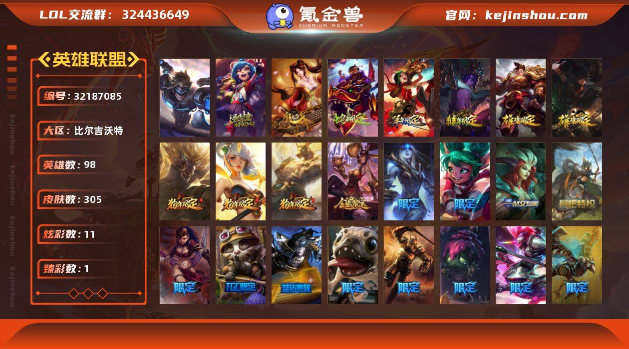 【LOLYH1650】98英雄/305皮肤/1终极/1神话/64限定/1臻彩/11炫彩/22传说/66史诗/未定级/10周年 安妮/持七彩冰棍的雪人 易/古琴余韵 娑娜/龙年 孙悟空/碧玉之牙 卡西奥佩娅/神龙之翼 库奇/神龙烈焰 金克丝/紫金罗刹 莫甘娜/张辽 文远/虎痴之拳 蔚/南天之怒 沃里克/北辰之威 内瑟斯/春晖神女 拉克丝/烈焰美人 薇恩/甜心之羽 霞/觅心猎手 薇恩/幸福女神 乐芙兰/持胡萝卜的雪人 易/圣诞开心鬼 提莫/圣诞狂欢 时光/“主人不要我了” 阿木木/胡桃夹子 小丑/邪恶圣诞老人 维迦/夺命美人 卡特/冰雪节 茂凯/冬季仙境 发条/雪默丁格/圣诞玩偶 波比/圣诞驯鹿 克格莫/圣诞老人 布隆/冰雪节 炼金/未来战士/哥特萝莉 安妮/元老议会 玛尔扎哈/卧虎藏龙 贾克斯/斩星魔剑 易/冠军之隐 劫/S1FNC 酒桶/S1FNC 迦娜/S1FNC 嘉文四世/S2 暗杀星 蒙多/S3 SKT T1 婕拉/S3 SKT T1 李青/S4 SSW 炼金/S4 SSW 图奇/S5 SKT T1 阿利斯塔/S6 SKT T1 烬/S6 SKT T1 娜美/3周年 厄运小姐/4周年 锐雯/鬼影重重 魔腾/鬼影森森 茂凯/无头骑士 赫卡里姆/蓝色忧郁 崔斯特/密林猎手 提莫/女猎手 希维尔/野兽猎人 瑟庄妮/波比的巧克力工坊/永恒之森 乐芙兰/勇者阿狸/电玩战魂 赫卡里姆/御星魔矢 艾希/钢铁之翼 艾尼维亚/防暴天使 凯尔/惊悚派对 阿木木/警用试作体K-9 内瑟斯/克格汪/铁哥们儿 奥拉夫/地狱之门卫士 加里奥/战地机甲 厄加特/大天使长米迦勒 凯尔/战场女武神 凯尔/恶魔男爵 瑞兹/驯龙炮手 崔丝塔娜/绅士 科加斯/双重冰晶 艾尼维亚/律政大亨 蒙多/女主播 迦娜/最终BOSS 维迦/陆地王者4WD 布里茨/苹果机器人 布里茨/冰川巨兽 墨菲特/源计划:净化 薇恩/炼狱魔犬 内瑟斯/钢铁军团 盖伦/黯黑魔龙 希瓦娜/符文战熊 沃利贝尔/宇航员 诺提勒斯/泳池派对 吉格斯/安伯斯与提妮/翼骑统领 赵信/摄魂男爵 弗拉基米尔/圣光审判 凯尔/地狱火 阿利斯塔/战争机器 赛...