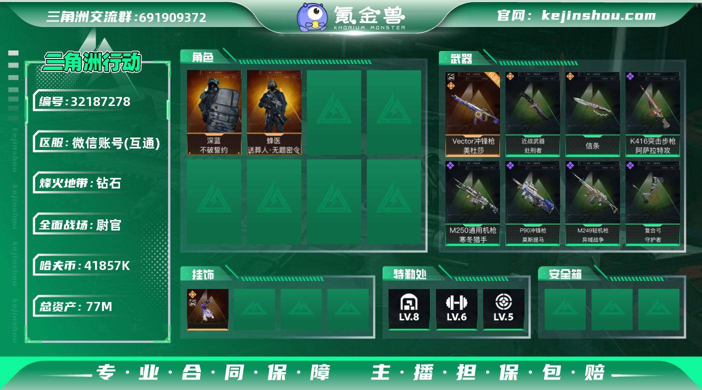 实名:可二次实名 总资产:77M 哈夫币:41857K 烽火地带段位:钻石 烽火地带等级:60 全面战场段位:尉官 全面战场等级:50 8级仓库,6级训练中心,5级靶场,1级潜水中心,0级收藏室