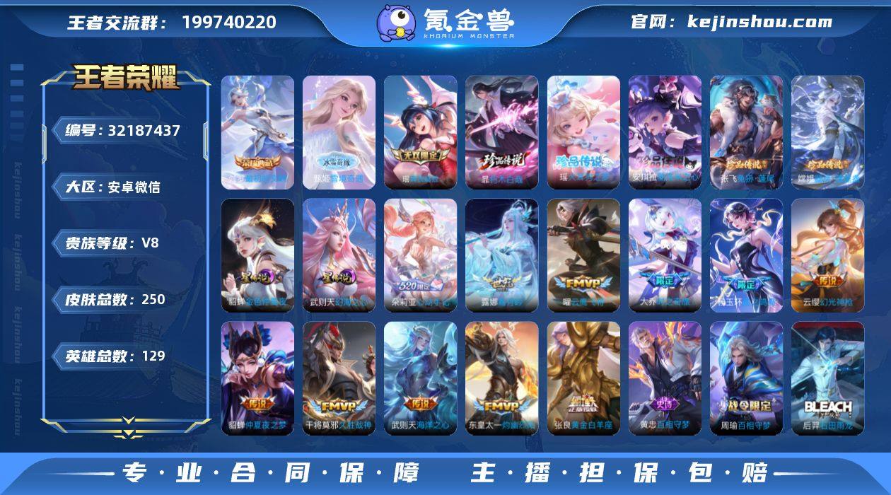 繁花·九霄神辉·最初的交响·雪境奇遇·真我赫兹·朽木白哉·酷洛米之心·大耳狗之梦·兔狲蓬尾·器灵落星盏·幻海之心·金色仲夏夜·满马年限定·愿照九州拓·姬愿照岁时盈·心动手记·霜月吟】【可二次】w16932-安卓WX-129英雄-250皮肤-4王者印记-110铭文-贵族积分8w【贵族8】【3典藏·1珍品无双·2无双·5珍品·2星传说·23传说·29按键】【因赛季更新游戏段付以上号为准!】 【英雄全皮】:孙权全皮,敖隐全皮,空空儿全皮,影全皮,海诺全皮 【荣耀典藏】:武则天英雄,花木兰九霄神辉,伽罗最初的交响 【珍品无双】:貂蝉馥梦繁花 【无双皮肤】:甄姬雪境奇遇,瑶真我赫兹 【珍品传说】:暃朽木白哉,安琪拉酷洛米之心,瑶大耳狗之梦,张飞兔狲蓬尾,嫦娥器灵落星盏 【星元皮肤】:武则天幻海之心,貂蝉金色仲夏夜 【传说皮肤】:云缨神骥越千峰,关羽神骥镇沧海,朵莉亚神骥鸣幻洲,狄仁杰神骥赴朔漠,貂蝉神骥聚万邦,马超神骥逐星野,后羿神树通天,杨玉环星之鸣奏,澜愿照九州拓,虞姬愿照岁时盈,云缨幻光神枪,桑启鸣野蒿,朵莉亚心动手记,露娜霜月吟,大乔时之奇旅,东皇太一灼幽烈阳,吕布怒海麟威,虞姬启明星使,曜云鹰飞将,张良黄金白羊座,干将莫邪久胜战神,貂蝉仲夏夜之梦,武则天海洋之心 【限定皮肤】:大乔绒语心约,虞姬夏日便利店,姜子牙天穹之誓,杨戬破阵退雄兵,狄仁杰阴阳师,赵云皇家上将,芈月幻夜卜梦,元歌云间偶戏,元歌无心,马可波罗暗影游猎,狄仁杰魔术师,项羽海滩派对,虞姬启明星使,女娲朔望之晖,雅典娜单词大作战,大乔时之奇旅,公孙离蜜橘之夏,公孙离玉兔公主,米莱狄胡桃异想国,上官婉儿梁祝,上官婉儿神器万象笔,嫦娥拒霜思,嫦娥暖冬兔眠,西施玲珑珍味,艾琳流音漫舞,阿古朵江河有灵,张良古海寻踪,蒙犽百解令,妲己灵卜魔法,鬼谷子天穹祈灯,伽罗琥珀纪元,姬小满妄想食味...