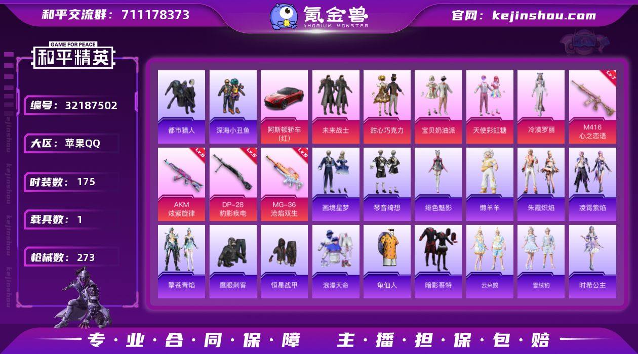 YZJ15369-可二次-苹果Q-3稀有1载具5粉装8特效枪13热门【精品身法号 伤感小雾神套装 巧克力三姐妹 冷漠罗丽 都市 双马尾 红眼罩 天命 恒星战甲 时希公主 满级M4心之恋语 小拳击手-伙伴 7款飞行器】175套装273枪皮 82003热力值 11印记 历史卓越王牌10星 【3稀有】 AKM-百万伏特 都市猎人 浪漫天命 【1载具】 阿斯顿马丁S红色 【5粉装】 宝贝奶油派 天使彩虹糖 甜心巧克力 冷漠罗丽 未来战士 【8特效枪】 M416-心之恋语 (7级) AKM-炫紫旋律 (6级) AKS-74U-森灵之息 (5级) MG-36-沧焰双生 (5级) DP-28-豹影疾电 (5级) Mk14-福马献瑞 (5级) UMP45-萌骑冒险 (2级) ACE32-萌骑漫游 (2级) 【13热门】 龟仙人 鹰眼刺客 深海小丑鱼 暗影哥特 团圆交子 瑞龙福将 冰爽海盐 破蛋小黄鸡 黑色刀锋 赛博空间 M762-瑞龙福将 M249-古堡领主 M24-香水柠檬 【1飞行器】 四圣焕新飞行器 【2头盔】 金曜白虎头盔 甜心宝贝头盔 【5背包】 火曜朱雀背包 甜心宝贝背包 幻影战神背包 深海曼妙背包 夏日绵绵冰背包 营地ID:759469913