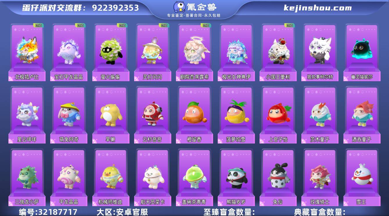 千山绘灵青岚独角兽芬妮亚太空船长贝贝暴龙崽崽鲨莉娃暗夜皇女茜拉雪原之心伊芙剧院院长魅影"性别:女 等级:55 段位:三阶鸡蛋 历史潮流:12.6w 幻彩套装数量:17 紫色套装数量:100 幻彩套装:千山绘灵青岚 独角兽芬妮亚 太空船长贝贝 暴龙崽崽 鲨莉娃 暗夜皇女茜拉 雪原之心伊芙 剧院院长魅影 天穹骑士-湛 天穹骑士-虹 苗疆圣女蚩离 流火精灵舞舞 捕梦软软 川剧少女梧桐 圣翼天使-堕 蔷薇白皇后 醒狮蛋宝 紫色套装:执法官布谷 发美美 鲤鱼姬小锦 神兽嘲风 御狸奴 打菜侠妙妙 音乐家蕾利 狼执事柯尔特 企鹅心心 暹罗猫 小福袋添运 雪怪瓦图鲁 北极兔卢米 道具师芙芙 袋鼠嘟宝 魔灯闪闪 刺猬绷绷 星云咩咩 盖碗茶青青 狸猫大力 三角龙小萨 甲龙晶晶 仓鼠米仔 松山山 铃兰三月兔 嗷嗷 萌兔阿奇 大娃 幽猎塞莉诺 幽灵猫妮莎 猴吼吼 小国王蕾利 飞天小猪班尼 面包狗松松 酷洛米 大耳狗 幻想毛怪 极光女神典伊 北极狐卢比 梨花诗 花如意 陆小果 元起丸子 骨精灵 剑侠客 小太阳葵葵 剧院首席露希 小演员露希 猪猪侠 美羊羊 小灰灰 灵灯闪闪 洗澡duckoo 吟游诗人弥亚 天狗刑云 神月将军夜魄 白羽仙女索菲 渔女 巴尔坦星人 泽塔 赛罗 迪迦 萤火偷偷 海藻偷偷 雪王 玫瑰骑士 熊猫岁岁 兔仙 仙人掌丘丘 机械师维迪 航天员莱卡 酒吞童子 茨木童子 莹草班主任 宝石甲龙晶晶 蜜蜂dongdong 上官子怡 菠萝吹雪 橙留香 云村音音 八音盒温妮 水母尤莱亚 涂山浅浅 灰太狼 懒羊羊 喜羊羊 苹果派雪雪 梅海海 吾皇猫 巴扎黑 蓝樱爱丽丝 红小豆 杰克 仔仔熊 dongdong 水波蛋 旱獭 圆圆子 糖心公主 淘气丸子 背饰:彩虹星愿 青鸾仙羽 月白之隐 碎晶幻翼 垂耳兔背包 浅海蓝灵 鲨都有 众星孤月 天马法杖 孤岛之鲸 幽灵剧院 隐月耀盾 天照耀盾 雪貂竹篓 流火花环 美梦指南针 太空猫包 蜀风古韵扇 木质怪兽玩具 蝴蝶之梦 绘山河折扇 裁决圣...