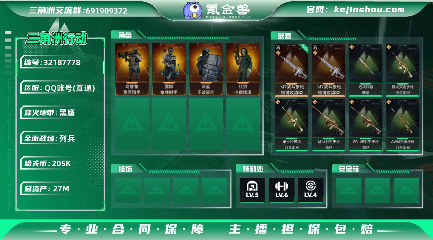 【SJZF6393】总资产(M):27M/哈夫币(K):205K/哈夫币(K):205K/传说枪皮数:21/全面战场等级:7_段位:列兵/烽火地带等级:60_段位:黑鹰/深蓝-不破誓约(S6)/红狼-电锯惊魂/露娜-金牌射手(S7)/乌鲁鲁-荒原猎手/近战-暗星/近战-黑鹰/M7战斗步枪-棱镜攻势S2/优品B典藏武器外观-M7战斗步枪-棱镜攻势S2/SG552突击步枪-运动员/SG552突击步枪-点翠/SCAR-H战斗步枪-启航/SCAR-H战斗步枪-荼蘼/腾龙突击步枪-万金泪冠/KC17突击步枪-电锯惊魂/KC17突击步枪-点翠/MK47突击步枪-暗星/SR-3M紧凑突击步枪-暗星/SR-3M紧凑突击步枪-荼蘼/勇士冲锋枪-万金泪冠/PKM通用机枪-荼蘼/M250通用机枪-骑士之心/M14射手步枪-蛮荒/M14射手步枪-缄花/SKS射手步枪-骑士/SR-25射手步枪-缄花/PSG-1射手步枪-点翠/AWM狙击步枪-万金泪冠/.357左轮-缄花/ASh-12战斗步枪-无极限/K416突击步枪-冬日风情/K416突击步枪-腊梅/M7战斗步枪-百步穿杨/G3战斗步枪-流沙送葬/G3战斗步枪-哈夫克警备/AS Val突击步枪-百步穿杨/K437突击步枪-守护者/K437突击步枪-丛林谍踪/MP5冲锋枪-深海恐惧/MP5冲锋枪-战术竞备/MP5冲锋枪-竞技风/Vector冲锋枪-百步穿杨/SR-3M紧凑突击步枪-开工大吉/勇士冲锋枪-深海恐惧/勇士冲锋枪-工业狂潮/勇士冲锋枪-丛林谍踪/MP7冲锋枪-守护者/MP7冲锋枪-六套之力/M249轻机枪-丛林谍踪/QJB201轻机枪-炽焰/Mini-14射手步枪-守护者/VSS射手步枪-丛林谍踪/M14射手步枪-工业狂潮/M14射手步枪-航天庆典/SR-25射手步枪-聚光灯/M700狙击步枪-蝮蛇/M700狙击步枪-百步穿杨/AWM狙击步枪-无极限/AWM狙击步枪-流沙送葬/沙漠之鹰-曙光/复合弓-守护者/R93狙击步枪-地平线/M4A1突击步枪-繁盛/AKM突击步枪-战术演练/AKM突击步枪-肃杀/QBZ95-1突击步枪-公平竞技/ASh-12战斗步枪-繁盛/K416突击步枪-一帆风顺/M7战斗步枪-捣蛋鬼/SG552突击步枪-2026/SG552突击步...