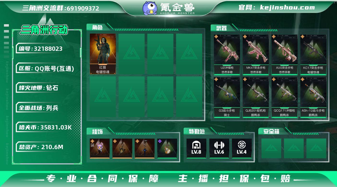 实名:可二次实名 总资产:210.6M 哈夫币:35831.03K 烽火地带段位:钻石 烽火地带等级:60 全面战场段位:列兵 全面战场等级:13 8级仓库,6级训练中心,4级靶场,4级指挥中心,1级潜水中心,3级防具台,3级工作台,3级制药台,3级技术中心,0级收藏室 战术部门等级:3 战斗部门等级:2 医疗部门等级:2 研发部门等级:1 后勤部门等级:1 曼德尔砖-气象感应:0 曼德尔砖-命运王牌:0 曼德尔砖-电玩高手:0 曼德尔砖-美杜莎:0