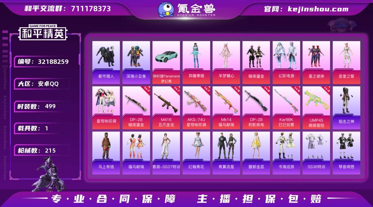 - 游戏:和平精英 - 区服:安卓手Q - 账号等级:卓越收藏家 68级 - 历史总热力值:65721 - 王牌印记:14个王牌印记] - KD:10.0] - 载具:保时捷帕拉梅拉 - 粉装套装:星之彼岸、异瞳寒姬、羊梦糖心、幻彩电音、星穹咏叹、圣堂之誓、暗夜鎏金、快乐星愿等 - 套装总数:137件 - 枪械皮肤:215把 特效枪名称:M416-心之恋语、AKM-甜心宝贝]) - 战备道具:150件 - 可二次实名 ✅ - 无违规封禁记录 - 支持平台官方验号 - 账号绑定情况:[仅绑定手机号,可换绑] ### ✨ 账号核心亮点 - **载具**:保时捷Panamera(梦幻青),热门载具,颜值拉满 - **特效枪**: ✅ M416-五爪金龙(7级) ✅ AKS-74U-星穹咏叹调(7级) ✅ DP-28-暗夜鎏金(7级) ✅ DP-28-豹影疾电(5级) ✅ MK14-福马献瑞(5级) ✅ Kar98K-巳巳如意(5级) ✅ UMP45-萌骑冒险(3级) - **粉装/角色**:星之彼岸、异瞳寒姬、羊梦糖心、幻彩电音、圣堂之誓、星穹咏叹调、