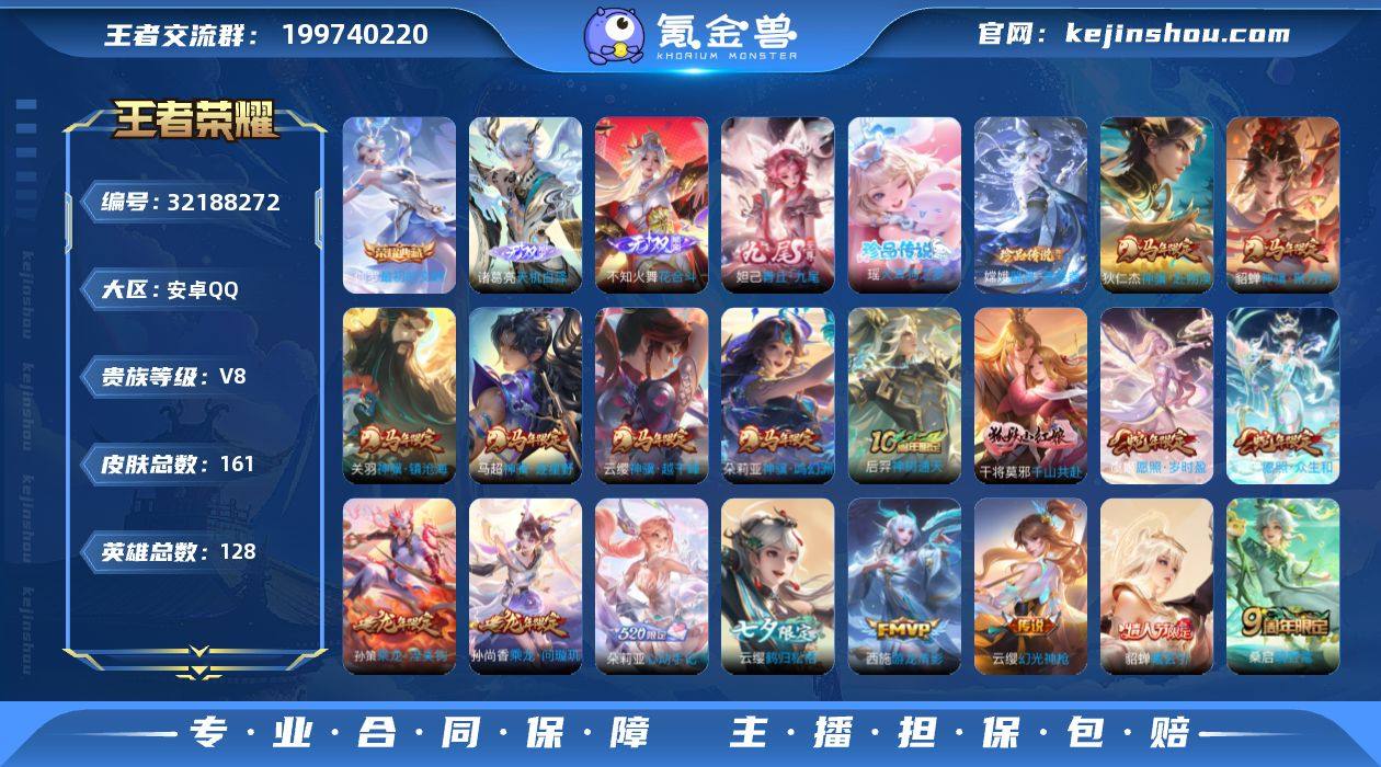0B6KLL可二次无双3水晶1珍品传说2女号传说24优质限定25 信用分合格 钱包已注销 水晶皮肤:最初的交响, 无双皮肤:青丘·九尾,花合斗,天机白泽, 珍品传说皮肤:器灵·落星盏,大耳狗之梦, 新传说限定:神骥·镇沧海,神骥·逐星野,神骥·越千峰,神骥·聚万邦,千山共赴,神骥·赴朔漠,神骥·鸣幻洲, 传说限定:乘龙·淬吴钩,琥珀纪元铠,鹤归松栖(云缨),愿照·众生和,貂蝉曦玄引,星穹之声,乘龙·问璇玑,愿照·岁时盈,炽翼辉光,朵莉亚心动手记,神树通天,启明星使, 传说皮肤:幻光神枪,游龙清影,云霓雀翎,淬星耀世,鸣野蒿, 新史诗限定:万灵启世,涂山容容,幻珠鲛人, 史诗限定:东方月初,海诺心动手记,涂山红红, 新史诗皮肤:石田雨龙,百相守梦-黄忠, 周年皮肤:江河有灵,鹤鸣心笺,神树通天, 珍宝阁:万物之道, 史诗皮肤:幽灵船长,苍穹之光,德古拉伯爵,节奏热浪,缤纷独角兽,龙骑士,冰雪圆舞曲,水果甜心,鹰眼统帅,特工魅影,绅士熊喵,天才门将,乱世虎臣,猫狗日记-大乔