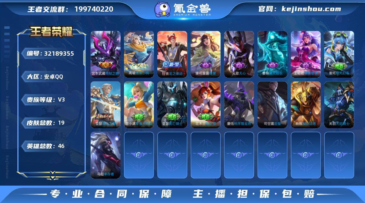 安卓Q-V3-永恒钻石IV段位-46英雄-19皮肤-3传说-5史诗【传说皮肤】:云缨神骥越千峰,花木兰异界灵契,宫本武藏地狱之眼【限定皮肤】:元歌无心【赛季限定】:亚瑟荣光之誓【战令限定】:周瑜线条小狗【史诗皮肤】:周瑜线条小狗,狂铁龙之律动,元歌无心,娜可露露晚萤,曹操幽灵船长,王昭君偶像歌手【其他皮肤】:蚩奼极光幻客,亚瑟荣光之誓,姬小满零食大作战,花木兰兔女郎,亚瑟死亡骑士,司空震启蛰,蒙恬秩序猎龙将,马超幸存者,杨戬埃及法老,关羽天启骑士【营地ID】:1523320962
