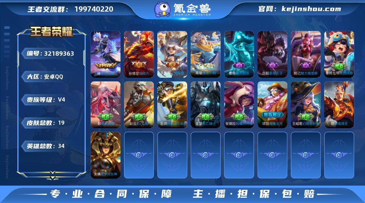 安卓Q-V4-至尊星耀I段位-34英雄-19皮肤-4传说-3史诗【英雄全皮】:影全皮【传说皮肤】:马超神骥逐星野,澜逐花归海,李元芳飞鸢探春,孙悟空地狱火【限定皮肤】:项羽海滩派对【战令限定】:周瑜线条小狗【史诗皮肤】:周瑜线条小狗,白起星夜王子,曹操幽灵船长,妲己魅力维加斯【其他皮肤】:吕布舞狮寰,鲁班七号班班快跑,影魅影绮裳,王昭君幻想奇妙夜,后羿阿尔法小队,亚瑟死亡骑士,安琪拉玩偶对对碰,赵云忍炎影,项羽海滩派对,女娲尼罗河女神,铠龙域领主【营地ID】:1525138162