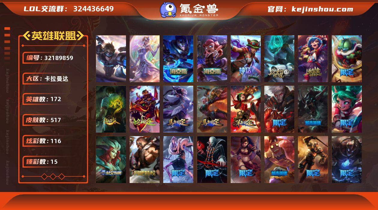 【LD5189】172英雄/517皮肤/2终极/5神话/86限定/15臻彩/116炫彩/45传说/135史诗/未定级/10周年 安妮/源代码 乐芙兰/十五周年纪念 希维尔/海克斯 安妮/海克斯 嘉文四世/天龙之子 卡莎 飞龙乘云/无畏骑士 瑟庄妮 赤子初心/墨之影武者 亚索 金墨耀影/霸天战士 雷恩加尔 星啸天火/源计划: 毁灭 派克 幻灭/黎明使者 锐雯 黑夜使者/玉剑传说 无劫 胭脂/玉剑传说 翼剑仙 珠光/霸天巨兽·雪崩 墨菲特/战斗学院 盖伦 不死鸟/魔女 阿卡丽 虚荣/净雪之月 莫甘娜 冬虹/这货不是银狐-库奇/心之钢 伊泽瑞尔 天纵才华/龙的传人 李青/神龙之翼 库奇/替父从军 花木兰/广寒仙子 嫦娥/神龙烈焰 金克丝/觅心之翼奎因/幸福女神 乐芙兰/圣诞开心鬼 提莫/圣诞精灵 崔丝塔娜/圣诞狂欢 努努/圣诞糖果棒 厄运小姐/“主人不要我了” 阿木木/胡桃夹子 小丑/平安夜女神 娑娜/英勇玩具兵船长/冬季仙境 卡尔玛/邪恶圣诞老人 维迦/冰雪节 茂凯/雪默丁格/雪装 奈德丽/圣诞玩偶 波比/圣诞老人 酒桶/圣诞驯鹿 克格莫/魄罗骑士 瑟庄妮/寒冬精灵 璐璐/大元素使/未来战士/生化领主 泰达米尔/卧虎藏龙 贾克斯/诺斯费拉图 弗拉基米尔/冠军之血 希瓦娜/冠军之刃 锐雯 2016/S2 暗杀星 蒙多/S2 暗杀星 努努/S2 暗杀星 慎/S2...
