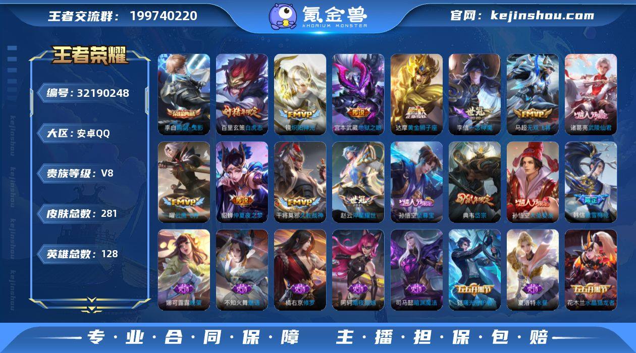 安卓Q-V7-最强王者段位-127英雄-311皮肤-2典藏皮肤-1珍品传说-12传说-88史诗【英雄全皮】:猪八戒全皮,影全皮【荣耀典藏】:李白鸣剑曳影,安琪拉颠倒童话魔镜【珍品传说】:孙策时之奇旅【传说皮肤】:司空震愿照山河定,澜愿照九州拓,桑启鸣野蒿,李元芳飞鸢探春,公孙离祈雪灵祝,镜炽阳神光,关羽武圣,曜云鹰飞将,貂蝉仲夏夜之梦,孙尚香末日机甲,宫本武藏地狱之眼,孙悟空地狱火【限定皮肤】:白起狰,蒙犽顽岩魄,蔡文姬夏日便利店,虞姬夏日便利店,姜子牙天穹之誓,狄仁杰阴阳师,赵云皇家上将,墨子神迹守卫,鲁班七号狮舞东方,庄周高山流水,高渐离死亡摇滚,高渐离玩趣恶龙,阿轲迷踪丽影,钟无艳王者之锤,芈月重明,芈月幻夜卜梦,吕布猎兽之王,元歌云间偶戏,夏侯惇朔风刀,曹操烛龙,典韦穷奇,典韦蓝屏警告,马可波罗暗影游猎,马可波罗山海玄木吟,狄仁杰魔术师,狄仁杰万华元夜,达摩星际陆战队,达摩沙漠行僧,项羽海滩派对,老夫子醍醐杖,老夫子航海奇遇记,关羽武圣,程咬金演武夺筹,刘邦夺宝奇兵,韩信飞衡,兰陵王金庭之子,亚瑟潮玩骑士王,孙悟空大圣娶亲,孙悟空孙行者,牛魔御旌,后羿圣弓游侠,李元芳银河之约,李元芳云中旅人,钟馗神迹守卫,钟馗驱傩正仪,杨玉环遇见飞天,女娲朔望之晖,干将莫邪胡桃夹子,干将莫邪真爱魔法,雅典娜单词大作战,雅典娜黎明之约,蔡文姬繁星吟游,太乙真人华丽摇滚,鬼谷子原初探秘者,鬼谷子五谷丰年,黄忠火炮绅士,苏烈千军破阵,百里玄策原初追逐者,百里守约朱雀志,弈星混沌棋,梦奇顽趣,公孙离祈雪灵祝,沈梦溪星空之诺,沈梦溪大漠名商,明世隐疑决卦,裴擒虎李小龙,裴擒虎擒涛扼浪,狂铁御狮,米莱狄御霄,云中君纤云弄巧,盾山御銮,猪八戒西部大镖客,猪八戒猪悟能,上官婉儿梁祝,嫦娥暖冬兔眠,蒙犽狂想玩偶喵,鲁班大师...