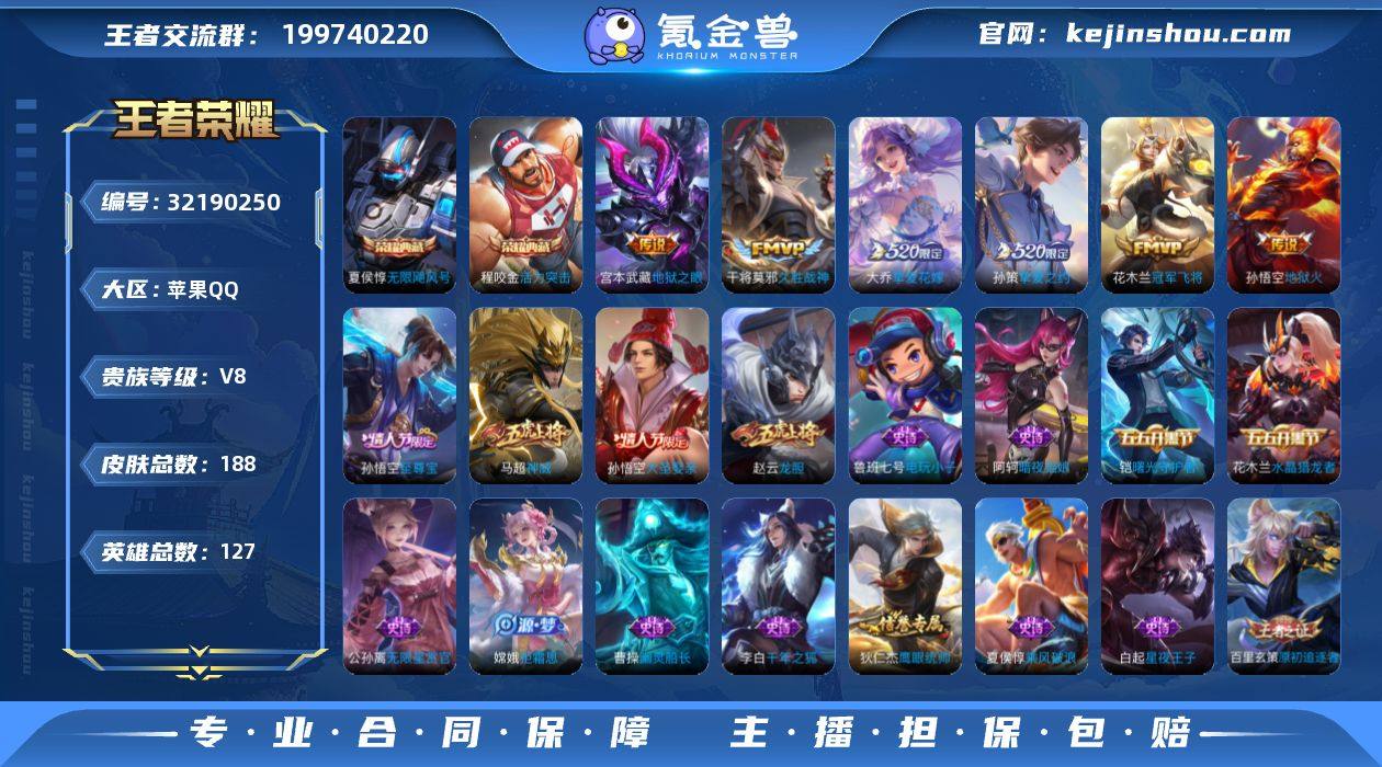 V8 2典藏 14传说 127英雄 188皮肤 可修改实名 金标夏侯 【英雄全皮】大禹全皮 【稀有英雄】大司命,嬴政(始皇帝),韩信(韩跳跳),夏洛特(夏师傅),艾琳,橘右京(橘子),娜可露露(鸟人),不知火舞,赵云,金蝉(唐僧),戈娅 【荣耀水晶】无限飓风号(高达),活力突击 【传说皮】地狱火,地狱之眼,冠军飞将,久胜战神,超时空战士-狄仁杰,挚爱之约,挚爱花嫁,百相守梦(张飞) 【珍宝阁皮】锁墨魂,玩趣恶龙 【赛季/战令皮】古海寻踪(s33),海盐诗旅(s30),擒涛扼浪(s31),探海日志(s32),顽趣-梦奇,天穹祈灯(s34),饕餮(s9),穷奇(s12),御狮(s13),御霄(s14),御旌(s15),御銮(s16),朔风刀(s17),混沌棋(s18),疑决卦(s19),醍醐杖(s20),原初探秘者(s21),演武夺筹(s23),驱傩正仪(s24),千军破阵(s25),猎兽之王,白昼王子,朔望之晖,蓝屏警告,神迹守卫-钟馗,狮舞东方,赤莲之焰,驯魔猎人,星空之诺,银河之约,夺宝奇兵,迷踪丽影,圣弓游侠,真爱魔法,沙漠行僧(s26),金庭之子(s27),大漠名商(s28),云中旅人(s29) 【史诗皮】线条小狗-周瑜,苍穹之光,电玩小子(小书包),千年之狐,百相守梦(刘备),无限星赏官,冰冠公主,偶像歌手,百相守梦(关羽),暗夜猫娘,猫狗日记-大乔,乱世虎臣,水果甜心,天才门将,星夜王子,时之奇旅-安琪拉,功...
