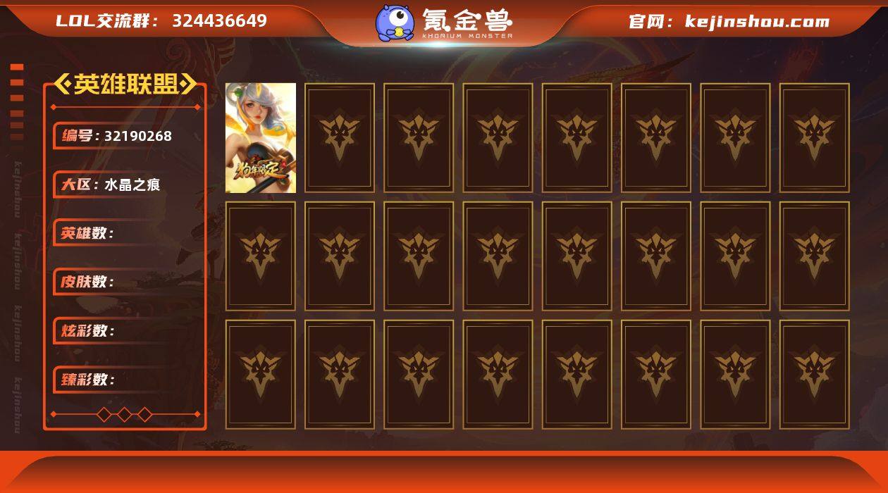 白银段位-172英雄-359皮肤-309炫彩-0终极-14神话-32限定-39传说-68史诗 【神话皮肤】:十周年纪念安妮,十五周年纪念希维尔,神凰行者瑞羽圣凰艾尼维亚,灰烬征服者潘森,海克斯科技斯维因,至臻至高天奎桑提,至臻斗魂觉醒萨科,至臻黑夜使者凯隐,至臻烈焰美人薇恩,至臻魅惑女巫莫甘娜,至臻神龙尊者均衡之龙沃利贝尔,至臻星之守护者辛德拉,至臻战斗学院蕾欧娜 【至臻皮肤】:至臻魅惑女巫莫甘娜,至臻斗魂觉醒萨科,至臻烈焰美人薇恩,至臻战斗学院蕾欧娜,至臻神龙尊者均衡之龙沃利贝尔,至臻凯旋将军德莱厄斯,至臻星之守护者辛德拉,至臻黑夜使者凯隐,至臻至高天奎桑提 【臻彩皮肤】:天龙之子卡莎飞龙乘云,无畏骑士瑟庄妮赤子初心,冠军典狱长锤石凯旋圣装,山海绘卷科加斯朱红,玉剑传说苍鸾丁香,魔女阿卡丽虚荣,净雪之月莫甘娜冬虹,预知之眼亚索不怠 【年限皮肤】:醒狮克格莫,司马懿仲达,点心宝贝阿木木 【海克斯皮肤】:海克斯科技斯维因 【情人节限定】:甜心之羽霞 【冰雪限定】:幸福女神乐芙兰,冬境仙灵索拉卡,胡桃夹子萨科,圣诞玩偶波比,冰雪驯鹿波比,圣诞老人古拉加斯,魄罗骑士瑟庄妮 【限定皮肤】:舞会公主安妮,SKTT1婕拉,SKTT1阿兹尔,玉剑传说神机花火,暗裔英雄盖伦,胜利凤凰艾尼维亚,胜利之王泰达米尔,胜利巨口克格莫,胜利女神娑娜,胜利剑圣易,胜利之运崔斯特,鬼影重重魔腾,魅惑女巫辛德拉,泳池派对李青,暗影沃里克,都铎王朝图奇,玉剑传说舞龙卫,制胜金球拉莫斯,制胜金靴李青,海之歌萨勒芬妮 【传说皮肤】:战地机甲厄加特,源计划林易,恶魔男爵瑞兹,黑夜使者索拉卡,提莫约德尔人的一大步,约德尔国队长提莫,合金巨兽努努和威朗普,女皇艾希,魔女伊芙琳,绅士科加斯,战地巨兽科加斯,最终BOSS维迦,女警狙击凯特琳,冰川巨兽墨菲特,地狱行者孙悟...
