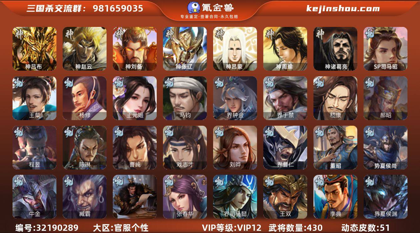 官阶:大将军;VIP等级:VIP12;史诗武将数量:65;动态皮肤数量:51;武将总数:430;史诗宝珠数量:4;将魂数量:3307;神将:5;魏国史诗武将:29;蜀国史诗武将:14;吴国史诗武将:8;群史诗武将:25 神吕布,神赵云,神刘备,神张辽,神诸葛亮,SP司马昭,王粲,杨修,王元姬,马钧,界钟会,界于禁,嵇康,郝昭,陈琳,曹纯,戏志才,刘晔,程昱,关索,马云騄,谋夏侯氏,谋赵云,谋马超,诸葛瞻,赵襄,张星彩,王平,沙摩柯,谯周,界黄忠,花鬘,董允,吴景,孙皓,骆统,留赞,界朱然,界徐盛,界步练师,贺齐,裴秀,星魏延,左慈,郑玄,张让,张琪瑛,杨彪,星黄忠,星甘宁,王允,陶谦,苏飞,司马徽,麹义,南华老仙,刘焉,沮授,界左慈,界李儒,公孙康,杜预,卑弥呼,许攸,兀突骨,士燮,神吕蒙,神周瑜,势夏侯尚,SP关羽,SP曹仁,SP蔡文姬,乐进,曹昂,诸葛诞,朱灵,文聘,SP姜维,张春华,钟会,曹冲,郭淮,满宠,界王异,界曹操,界司马懿,界夏侯惇,界张辽,界许褚,界郭嘉,李典,曹真,韩浩史涣,陈群,曹叡,曹休,钟繇,司马朗,王基,李通,郭皇后,孙资刘放,辛宪英,界甄姬,吕虔,鲁芝,蒯越蒯良,界典韦,界荀彧,界徐晃,杜畿,界曹丕,毌丘俭,界邓艾,张恭,界曹植,界曹彰,界满宠,界郭淮,卞夫人,界陈群,华歆,蔡贞姬,袁涣,王双,崔琰,杨阜,阮慧,谋徐晃,谋于禁,牛金,界夏侯渊,界曹仁,臧霸,唐咨,董昭,势陈到,SP孙尚香,关银屏,夏侯霸,马良,关兴张苞,廖化,界马岱,关平,简雍,刘封,界法正,界关兴张苞,界刘备,界关羽,界张飞,界赵云,界马超,SP徐庶,吴懿,周仓,张松,刘谌,夏侯氏,糜竺,马忠,孙乾,李严,黄皓,吴苋,秦宓,界黄月英,界诸葛亮,赵统赵广,严颜,界伊籍,界卧龙诸葛,界庞统,界孟获,界祝融,陈到,界姜维,界刘禅,胡金定,吕凯,张翼,杨仪,界廖化,邓芝,傅肜,界简雍,陈震,费祎,糜夫人,王甫赵累,界周仓,许靖,向宠,刘巴,彭羕,谋庞统,界张嶷,谋张飞,吴班,诸葛果,界魏延,蒋琬费祎,糜芳傅士仁,甘夫人,鲁肃,孙茹,凌操,大乔小...