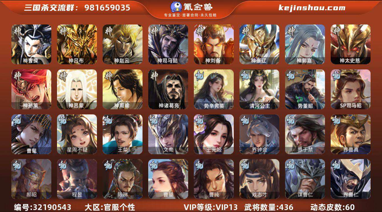 【3182】官阶:大将军;VIP等级:VIP13;史诗武将数量:75;动态皮肤数量:60;武将总数:436;史诗宝珠数量:94;将魂数量:11543;神将:10;魏国史诗武将:32;蜀国史诗武将:15;吴国史诗武将:12;群史诗武将:23 神曹操,神吕布,神赵云,神司马懿,神刘备,神张辽,神郭嘉,神太史慈,神孙策,神诸葛亮,SP司马昭,曹髦,星周不疑,谋曹仁,王粲,王元姬,界钟会,界于禁,界曹真,郝昭,陈琳,曹婴,曹纯,戏志才,势董昭,清河公主,势辛宪英,程昱,关索,马云騄,谋黄忠,谋赵云,谋马超,诸葛瞻,赵襄,张星彩,王平,沙摩柯,谯周,界黄忠,花鬘,董允,谋关羽,谋陆逊,吴景,孙皓,孙寒华,骆统,界朱然,界徐盛,贺齐,势陆郁生,势太史慈,文鸯,谋貂蝉,左慈,张让,张琪瑛,星黄忠,星甘宁,王允,陶谦,司马徽,麹义,南华老仙,刘焉,沮授,界左慈,界李儒,公孙康,杜预,卑弥呼,许攸,星董卓,兀突骨,司马昭,神吕蒙,神周瑜,SP关羽,SP曹仁,SP蔡文姬,乐进,曹昂,诸葛诞,朱灵,文聘,SP姜维,张春华,钟会,曹冲,郭淮,满宠,界王异,界曹操,界司马懿,界夏侯惇,界张辽,界许褚,界郭嘉,李典,曹真,韩浩史涣,陈群,曹叡,曹休,钟繇,司马朗,王基,李通,郭皇后,孙资刘放,辛宪英,界甄姬,吕虔,鲁芝,蒯越蒯良,界荀彧,界徐晃,杜畿,界曹丕,毌丘俭,界邓艾,张恭,界曹植,界曹彰,界满宠,界郭淮,卞夫人,华歆,蔡贞姬,袁涣,崔琰,毛玠,谋徐晃,谋于禁,牵招,胡班,司马孚,谋张辽,牛金,界夏侯渊,界曹仁,臧霸,唐咨,董昭,SP孙尚香,关银屏,夏侯霸,马良,关兴张苞,廖化,界马岱,关平,简雍,刘封,界法正,界关兴张苞,界刘备,界关羽,界张飞,界赵云,界马超,SP徐庶,吴懿,周仓,张松,刘谌,夏侯氏,糜竺,马忠,孙乾,李严,黄皓,界黄月英,界诸葛亮,赵统赵广,严颜,界伊籍,界庞统,界孟获,界祝融,陈到,界姜维,界刘禅,吕凯,张翼,杨仪,邓芝,傅肜,界简雍,陈震,费祎,糜夫人,王甫赵累,界周仓,宗预,刘巴,界吴懿,彭羕,谋庞统,谋黄月英,界张嶷,谋张飞,吴...