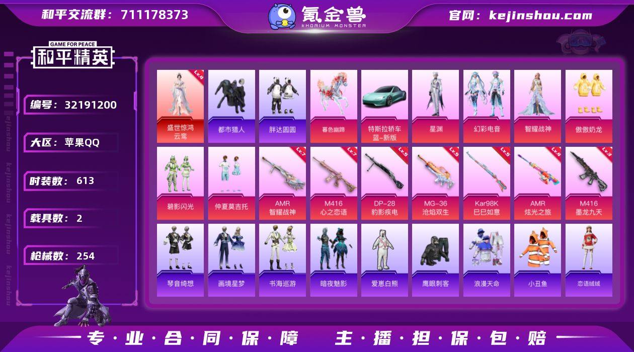 【特价出售】苹果Q-1红装2稀有2载具6粉装8特效枪18热门173套装254枪皮 88725热力值 17印记 历史传奇王牌13星 【1红装】 盛世惊鸿-云鸾 (4级) 【2稀有】 都市猎人 浪漫天命 【2载具】 暮色幽蹄 特斯拉R水滴蓝 【6粉装】 傲傲奶龙 星渊 智耀战神 幻彩电音 仲夏莫吉托 碧影闪光 【8特效枪】 M416-心之恋语 (7级) M416-墨龙九天 (3级) Kar98K-巳巳如意 (5级) MG-36-沧焰双生 (5级) DP-28-豹影疾电 (5级) AMR-智耀战神 (7级) AMR-炫光之旅 (4级) 撬棍-永恒法杖 (4级) 【18热门】 小丑鱼 龟仙人 爱崽白熊 鹰眼刺客 胖达圆圆 暗夜契约 团圆交子 瑞龙福将 纯白誓言 漫步者 韶华初心 薄荷蓝莓 青龙圣者 海洋之心 破蛋小黄鸡 极速红龙 军刀雅典娜 M762-瑞龙福将 【2飞行器】 龙翔九天飞行器 四圣焕新飞行器 【2头盔】 百万伏特头盔 马卡龙头盔 【1背包】 马卡龙背包