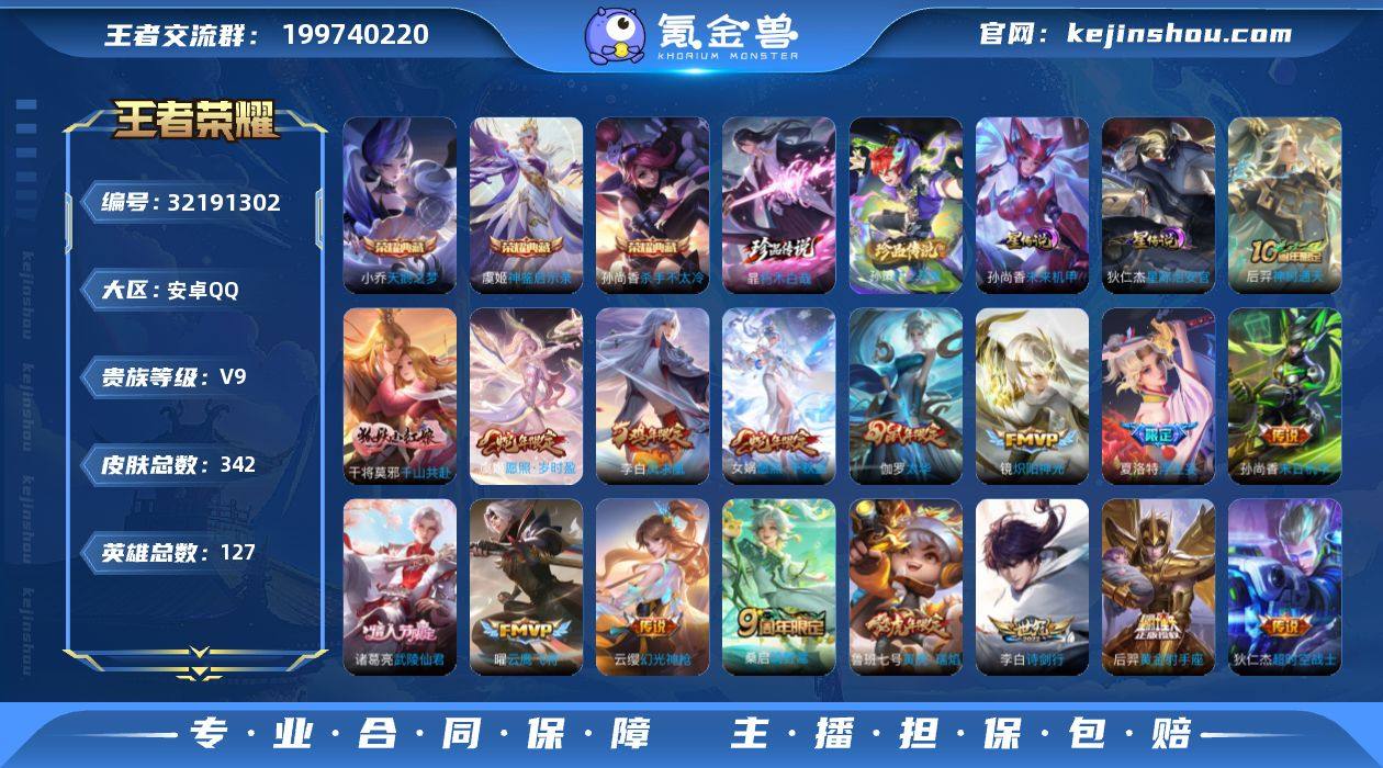 安卓Q-V9-最强王者段位-127英雄-342皮肤-3典藏皮肤-2珍品传说-21传说-109史诗 【英雄全皮】:孙权全皮,苍全皮,蒙恬全皮,夏洛特全皮 【荣耀典藏】:小乔天鹅之梦,孙尚香杀手不太冷,虞姬神鉴启示录 【珍品传说】:暃朽木白哉,孙策时之奇旅 【传说皮肤】:后羿神树通天,干将莫邪千山共赴,女娲愿照千秋盛,虞姬愿照岁时盈,云缨幻光神枪,桑启鸣野蒿,夏洛特浮生妄,李白诗剑行,鲁班七号寅虎瑞焰,镜炽阳神光,虞姬启明星使,曜云鹰飞将,伽罗太华,张良黄金白羊座,虞姬云霓雀翎,后羿黄金射手座,诸葛亮武陵仙君,李白凤求凰,孙尚香末日机甲,孙悟空地狱火,狄仁杰超时空战士 【限定皮肤】:白起狰,姜子牙天穹之誓,狄仁杰阴阳师,虞姬凯尔特女王,赵云皇家上将,墨子神迹守卫,妲己热情桑巴,妲己时之彼端,孙尚香蔷薇恋人,鲁班七号狮舞东方,鲁班七号寅虎瑞焰,庄周蜃楼王,高渐离玩趣恶龙,阿轲迷踪丽影,孙膑妖精王,扁鹊炼金王,芈月重明,芈月白晶晶,周瑜赤莲之焰,元歌云间偶戏,夏侯惇朔风刀,甄姬游园惊梦,曹操烛龙,典韦穷奇,典韦蓝屏警告,典韦岱宗,马可波罗暗影游猎,马可波罗山海玄木吟,狄仁杰魔术师,狄仁杰万华元夜,达摩星际陆战队,达摩沙漠行僧,项羽海滩派对,老夫子醍醐杖,老夫子航海奇遇记,程咬金演武夺筹,露娜一生所爱,刘邦夺宝奇兵,韩信飞衡,兰陵王驯魔猎人,兰陵王金庭之子,亚瑟狮心王,亚瑟潮玩骑士王,孙悟空至尊宝,孙悟空大圣娶亲,孙悟空孙行者,牛魔御旌,后羿如梦令,刘备百相守梦,李元芳银河之约,李元芳匿光侦查者,李元芳云中旅人,虞姬霸王别姬,虞姬启明星使,钟馗神迹守卫,钟馗驱傩正仪,女娲朔望之晖,干将莫邪冰霜恋舞曲,雅典娜单词大作战,雅典娜黎明之约,蔡文姬繁星吟游,太乙真人饕餮,鬼谷子原初探秘者,鬼谷子五谷丰年,诸葛亮武陵仙君,...