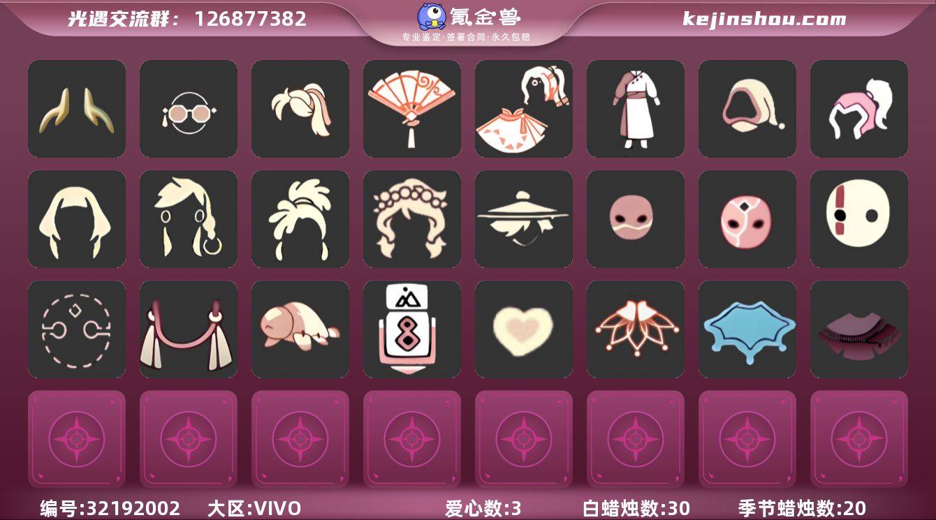 蜡烛数量:30 爱心数量:3 季节蜡烛数量:20 翼数量:70 织光季 织光季花瓣斗篷,瑞雪斗篷,紫金流苏斗篷 袍帽发型,士兵发型,留辫蘑菇头,吊环双辫发型,飒爽束发,花环,若笠 织光季横纹面具,织光季裂纹面具,右眼竖纹面具,黑脸 飘带耳坠 海牛玩具,相机,爱心抱枕 宝骏丹心马尾礼包,幸运亨通眼镜礼包,献瑞折扇礼包,衔福献瑞礼包,龙鳞束身长袍 卖家说:以游戏截图为主才玩不认识名字,织光季已买,差不多快毕业了。