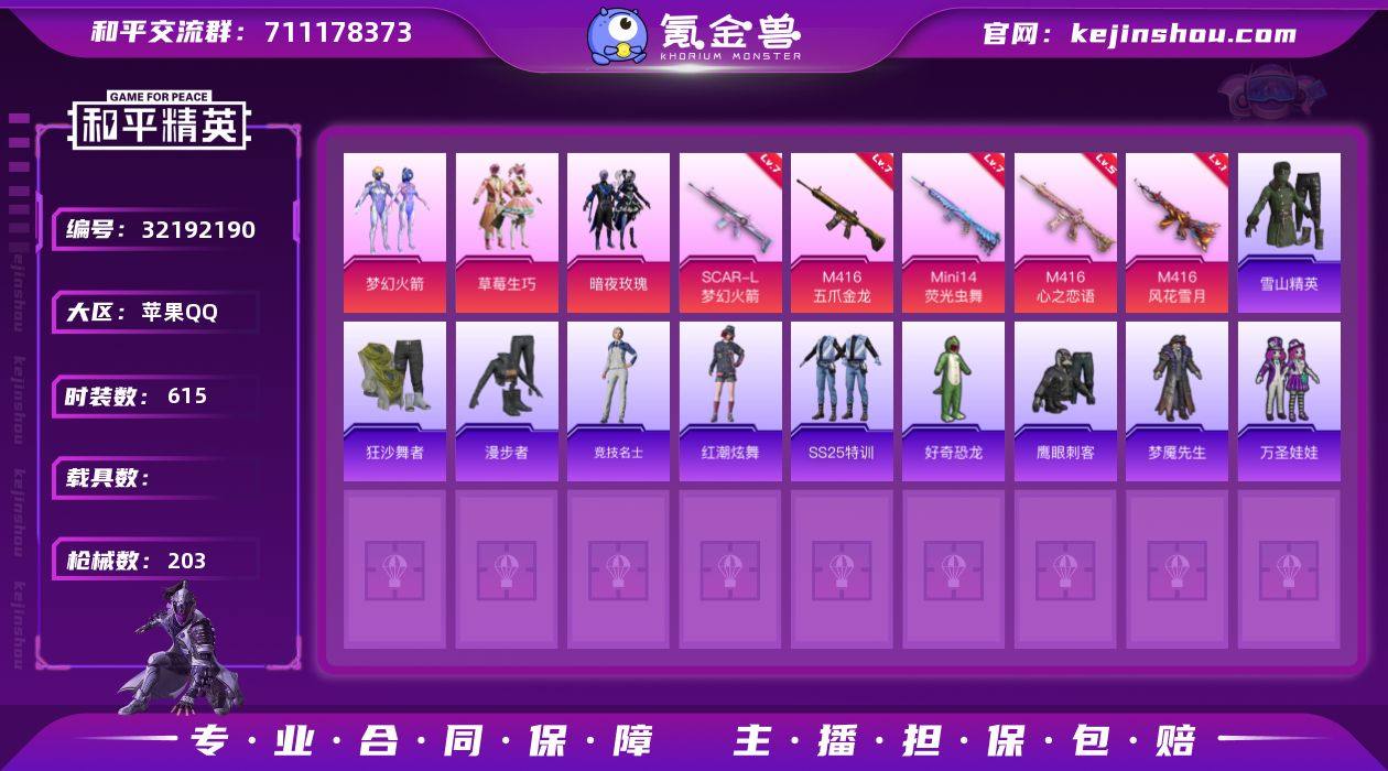【特价出售】苹果Q-3稀有3粉装6特效枪23热门156套装203枪皮 65918热力值 19印记 历史无敌战神 【3稀有】 M416-黄金龙骨 AWM-黄金龙骨 AKM-百万伏特 【3粉装】 梦幻火箭 草莓生巧 暗夜玫瑰 【6特效枪】 SCAR-L-梦幻火箭 (7级) M416-五爪金龙 (7级) M416-心之恋语 (5级) Mini14-荧光虫舞 (7级) M416-风花雪月 (1级) Mk14-福马献瑞 (1级) 【23热门】 雪山精英 糯粉咩咩 梦魇先生 万圣娃娃 鹰眼刺客 好奇恐龙 诡面顽熊 团圆交子 瑞龙福将 纯白誓言 狂沙舞者 漫步者 抹茶蜜豆 玄武圣者 机械英豪 破蛋小黄鸡 风华少年志 白月香洋装 黑色刀锋 军刀雅典娜 M762-瑞龙福将 AUG-PEC最牛战神 Kar98K-PEC最牛战神 【1飞行器】 梦幻火箭飞行器 【5头盔】 梦幻火箭头盔 金曜白虎头盔 百万伏特头盔 幻影战神头盔 金羽特工头盔 【5背包】 梦幻火箭背包 百万伏特背包 幻影战神背包 金羽特工背包 马卡龙背包