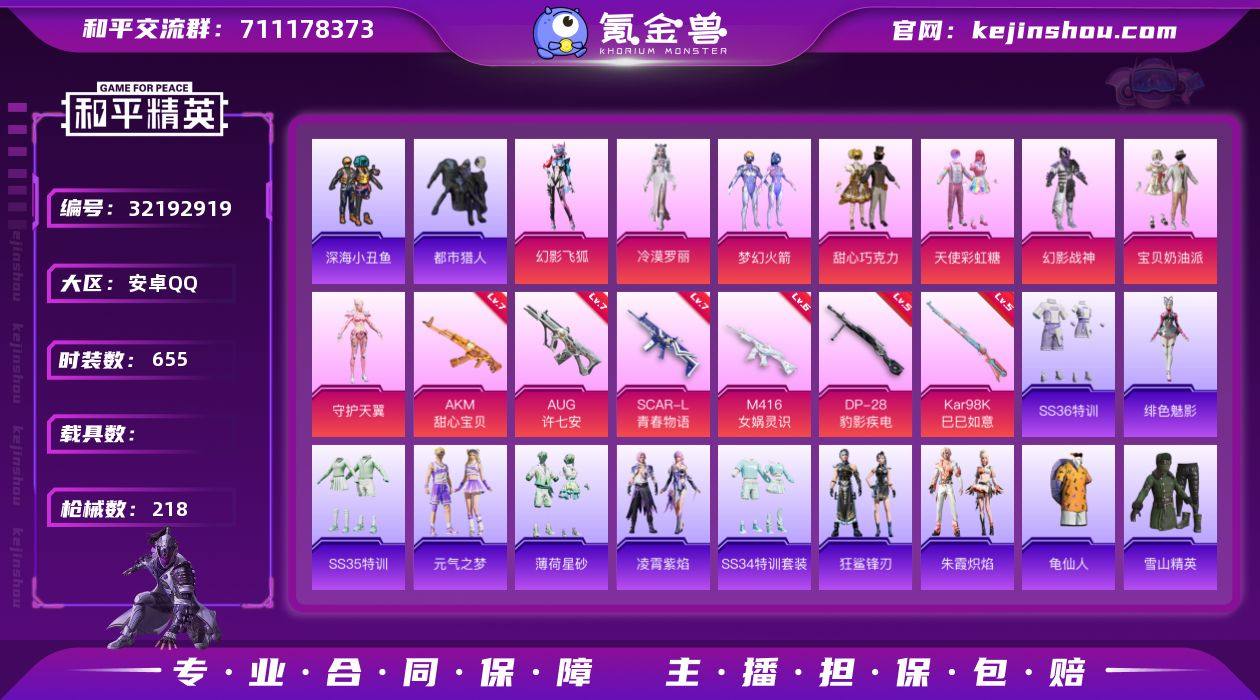 8枪8粉AUG许七安AKM甜心斯嘎7级M4女娲6级梦幻火箭甜心巧克力全套幻影战神都市猎人粉蚂蚱深海小丑鱼账号编号:C4097 能否转区:能 区服系统选项:安卓QQ 有二次 王牌印记数量:5 历史热力值:69111 套装数量:166 枪械皮肤:218 特效枪8:AUG-许七安/7级,,,AKM-甜心宝贝/7级,,M416-女娲灵识/6级,,SCAR-L-青春物语/7级,,ACE32-萌骑漫游/2级,,Mk14-福马献瑞/5级,,DP-28-豹影疾电/5级,Kar98K-巳巳如意/5级, 粉装8:梦幻火箭,,甜心巧克力,,幻影战神,,宝贝奶油派,,天使彩虹糖,,冷漠罗丽,,幻影飞狐,,守护天翼, 紫装: 都市猎人,粉蚂蚱,深海小丑鱼,浪漫天命, 滑翔尾迹:龙翔九天1级,极意拳锋 三级头:甜心宝贝1-3, 三级包:星之彼岸1-3,甜心宝贝1-3