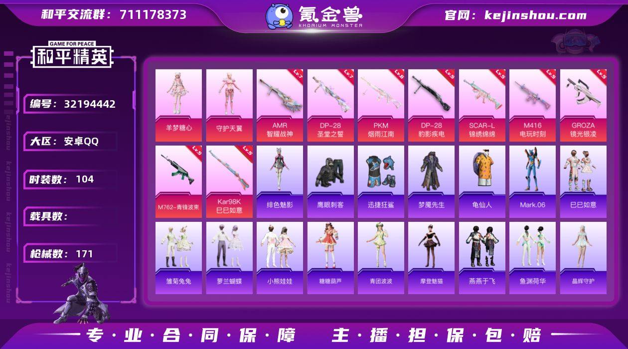 无二次-安卓 手Q-2粉装-10特效枪-0载具-1粉色飞行器-47681热力值-9王牌印记-104套装-171枪皮 【热门品类】:套装-龟仙人,角色-Mark.06 【粉色套装】:角色-守护天翼,角色-羊梦糖心 【粉色枪皮等级】:SCAR-L-锦绣绵绵(五级),M416-电玩时刻(五级),GROZA-镜光银凌(五级),M762-青锋波束(五级),UMP45-萌骑冒险(四级),Kar98K-巳巳如意(五级),AMR-智耀战神(七级),DP-28-圣堂之誓(七级),DP-28-豹影疾电(五级),PKM-江南烟雨(六级) 【粉色枪皮】:SCAR-L-锦绣绵绵,M416-电玩时刻,GROZA-镜光银凌,M762-青锋波束,UMP45-萌骑冒险,Kar98K-巳巳如意,AMR-智耀战神,DP-28-圣堂之誓,DP-28-豹影疾电,PKM-江南烟雨 【粉色飞行器】:炫彩糖果飞行器 【粉色降落伞】:潮汐统领降落伞,莲影清波降落伞,圣堂之誓降落伞,精灵梦叶罗丽降落伞,金丰海韵降落伞,千金淑猫降落伞,星穹咏叹调降落伞,喜羊羊与灰太狼降落伞,异瞳寒姬降落伞,极意拳锋降落伞,炫彩糖果降落伞 【稀有套装】:套装-龟仙人,套装-巳巳如意,套装-炫彩糖果,套装-雏菊兔兔,套装-萝兰蝴蝶,套装-小熊娃娃,套装-糖糖葫芦,套装-青团波波,角色-摩登魅猫,套装-燕燕于飞,套装-鱼渊荷华,套装-晶辉守护,套装-云朵鹅,套装-雪绒豹,角色-时希公主,角色-绯色魅影,角色-曹焱兵 【稀有枪皮】:AKM-彩虹符号,AKM-缤纷海域,AKM-虎虎生威,AKM-霓虹街区,AKM-龙的传人,M16A4-红色方程式,M16A4-蓝色火焰,SCAR-L-夜灯,SCAR-L-炫彩节奏,SCAR-L-玉兔迎春,SCAR-L-红色方程式,M416-糯团青竹,M416-红色方程式,M416-绯红前夜,M416-蓝色火焰,GROZA-影袭,AUG-天降萌叽,AUG-甜蜜菠萝,AUG-耀粉歌者,M762-云朵鹅,AC-VAL-快闪甜心,AC-VAL-闲梦青缨,蜜獾-天降萌叽,UZI-啾咪啾咪,UZI-天降萌叽,UZI-影袭,UZI-红色方程式,UMP45-夜灯,UMP45-...