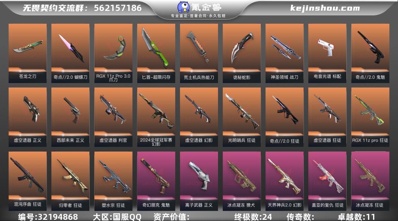【套装】:虚空遗器套装,奇点//2.0套装 【英雄】:幻棱,炼狱,维斯,暮蝶,钛狐,壹决,铁臂,捷风,雷兹,幽影,不死鸟,贤者,猎枭,蝰蛇,零,芮娜,奇乐,尚勃勒,霓虹,斯凯,夜露,星礈,K/O,海神,盖可,黑梦,钢锁 【近战武器】:近战武器-5周年//公测重制版 苍龙之刃,近战武器-奇点//2.0 蝴蝶刀,近战武器-紫金爪刀,近战武器-RGX 11z Pro//3.0 爪刀,近战武器-夜之蝴蝶,近战武器-源始幻刃,近战武器-超限闪存 匕首,近战武器-荒土机兵 热能刀,近战武器-诡秘蛇影 军刀,近战武器-神圣领域 战刀 【狂徒】:狂徒-光明哨兵,狂徒-归零者,狂徒-混沌序曲,狂徒-奇点//2.0,狂徒-塑水宗,狂徒-虚空遗器,狂徒-RGX 11z Pro,狂徒-般若假面//2.0,狂徒-冰点凝冻,狂徒-盖亚的复仇,狂徒-海洋之星,狂徒-紫阙金琅,狂徒-离子武器//2.0,狂徒-荒土机兵,狂徒-诡秘蛇影 【幻影】:幻影-2024全球冠军赛,幻影-虚空遗器,幻影-天界神兵//2.0,幻影-超限闪存,幻影-神圣领域,幻影-纳米打击,幻影-末日之翼 【戍卫】:戍卫-珍珠棘贝,戍卫-浮光跃金,戍卫-逆冲蛮牛,戍卫-战术熊与伙伴们,戍卫-月球哨兵,戍卫-折光棱晶 【獠犬】:獠犬-冰点凝冻,獠犬-神圣领域,獠犬-模拟赫兹,獠犬-逆冲蛮牛 【冥驹】:冥驹-堕天遗武,冥驹-荒土机兵,冥驹-复古浪潮,冥驹-模拟赫兹,冥驹-星云暗涌 【飞将】:飞将-战术熊与伙伴们,飞将-末日之翼 【莽侠】:莽侠-超限闪存,莽侠-诡秘蛇影,莽侠-纤云弄巧,莽侠-月球哨兵 【战神】:战神-神圣领域,战神-浮光跃金,战神-深海水族 【奥丁】:奥丁-流星兵团,奥丁-纳米打击,奥丁-末日之翼 【判官】:判官-虚空遗器,判官-诡秘蛇影,判官-纳米打击x 【雄鹿】:雄鹿-复古浪潮,雄鹿-模拟赫兹,雄鹿-逆冲蛮牛,雄鹿-月球哨兵 【骇灵】:骇灵-荒土机兵,骇灵-流星兵团,骇灵-珍珠棘...