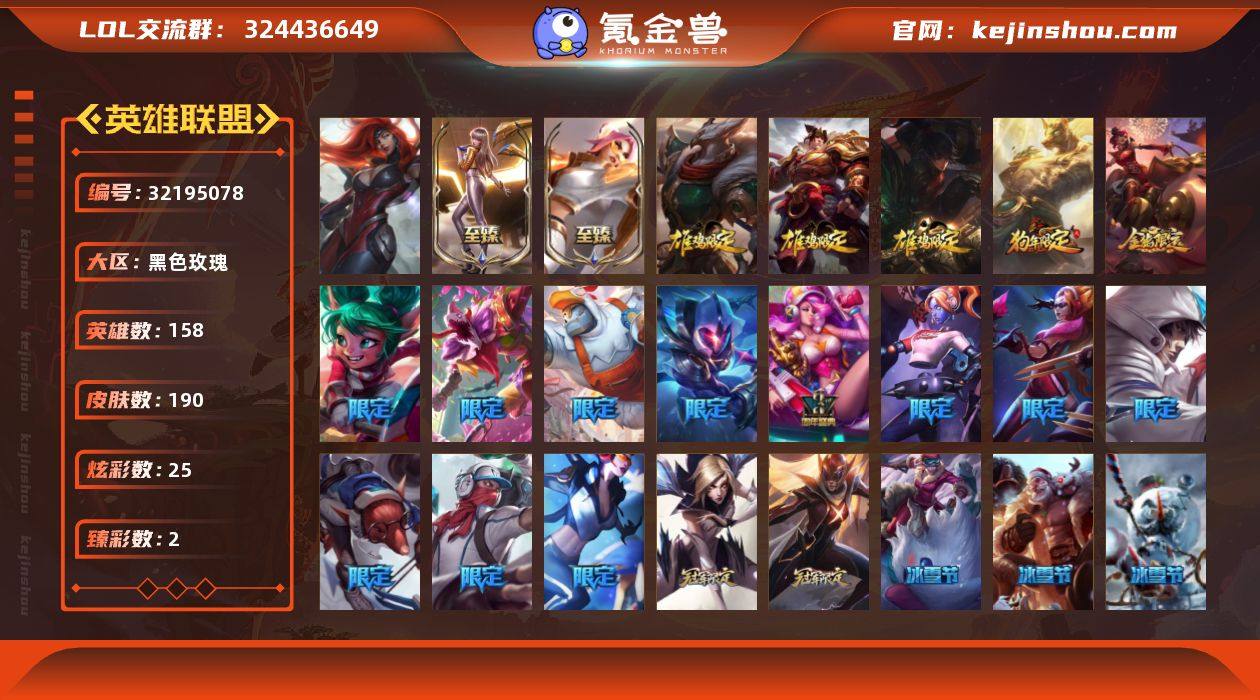 【LOLYH1651】158英雄/190皮肤/1终极/3神话/29限定/2臻彩/25炫彩/22传说/40史诗/青铜/10周年庆典 凤凰/至臻 福牛守护者 菲奥娜/至臻 K/DA 卡莎/无畏骑士 瑟庄妮 赤子初心/灵魂莲华 卡西奥佩娅 流火/张辽 文远/司马懿 仲达/虎痴之拳 蔚/北辰之威 内瑟斯/金猪烈焰 瑟庄妮/觅心游侠卢锡安/夺命美人 卡特/雪默丁格/雪装 奈德丽/魄罗骑士 瑟庄妮/圣诞老人 布隆/武装战姬/斩星魔剑 易/S2 暗杀星 发条/S3 SKT T1 婕拉/S4 SSW 炼金/S4 SSW 图奇/S4 SSW 泰隆/S5 SKT T1 蜘蛛/S8 IG 卡莎/S9 FPX 薇恩/3周年 厄运小姐/暗裔英雄 盖伦/南瓜头 费德提克/泳池派对 李青/波比的巧克力工坊/勇者阿狸/惊悚派对 费德提克/鸡里奥/魔幻卡牌 崔斯特/血石领主 弗拉基米尔/战场女武神 凯尔/约德尔国队长 提莫/欧米伽小队 幽灵特工/源计划:联合 艾希/战地巨兽 科加斯/律政大亨 蒙多/最终BOSS 维迦/未来战士 凯特琳/地狱行者 孙悟空/源计划:净化 薇恩/战斗学院 伊泽瑞尔/死亡骑士 盖伦/星之守护者 拉克丝/枯萎之壤 泽拉斯/冰霜亚龙 希瓦娜/偶像歌手 阿狸/黑夜使者 亚索/西部魔影 卢锡安/暗星 锤石/星之守护者 霞/腥红之月 崔斯特/特战先锋 赵信/翼骑统领 赵信/重生之沙 费德提克/侍魂 易/战争机器 赛恩/钢铁之心 希维尔/圣洁化身 索拉卡/火牙狼人 沃里克/紫晶射手 艾希/少林武僧 贾克斯/刀锋女王 莫甘娜/小小骑士 阿木木/飞越疯人院 萨科/战争血统 蒙多/五杀摇滚键盘手 娑娜/穿着正装的恶魔 维迦/北领前线 斯维因/沙漠风暴 卡特琳娜/符文战神 雷克顿/龙骑统帅 嘉文四世/战地机甲 斯卡纳/法老王朝 内瑟斯/四神之力 乌迪尔/军神战甲 波比/孤高游侠 盖伦/帝王斑蝶 克格莫/黑帮教父 格雷福斯/铁血猎人 雷恩加尔/铁血帝皇 德莱厄斯/暗黑女武神 黛安娜/勇敢的心 奎因/驯龙女巫 婕拉/西部牛仔 亚索/腥红之月 亚索/腥红之月 烬/黑帮狂花 金克丝/时...