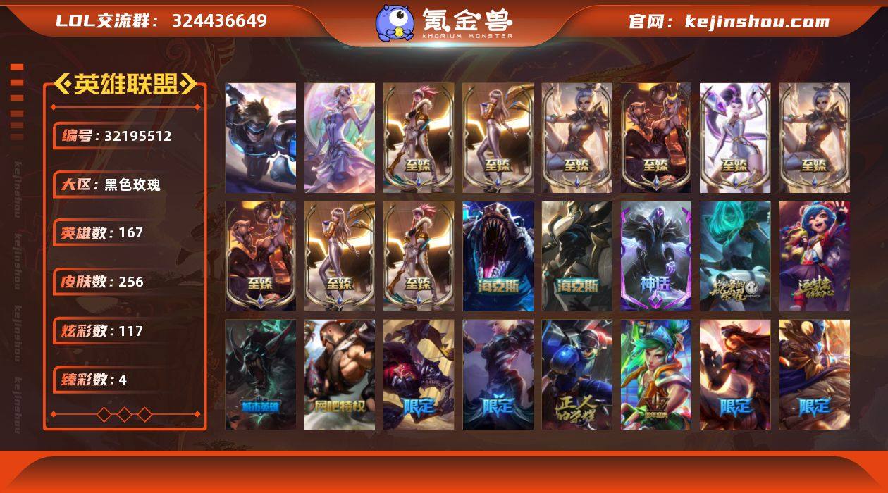 【Hyx238】电信大区黑色玫瑰-段位铂金4 【2终极 15神话 35限定 31传说 66史诗 256皮肤 117炫彩 167英雄】 可二次 【神话皮肤】:十周年纪念安妮,源代码乐芙兰,神凰行者瑞羽圣凰艾尼维亚,灰烬骑士派克,海克斯科技雷克顿,零之枪骑赫卡里姆,至臻KDA阿卡丽,至臻KDA阿卡丽2022,至臻KDAALLOUT卡莎,至臻KDA卡莎,至臻KDA卡莎2022,至臻烈焰美人薇恩,至臻烈焰美人薇恩2022,至臻玉剑传说武剑仙,至臻玉剑传说武剑仙2022 【至臻皮肤】:至臻烈焰美人薇恩,至臻烈焰美人薇恩(2022),至臻KDA阿卡丽,至臻KDA阿卡丽(2022),至臻玉剑传说武剑仙锐雯,至臻玉剑传说武剑仙(2022),至臻KDA卡莎,至臻KDAALLOUT卡莎,至臻KDA卡莎(2022) 【臻彩皮肤】:古琴余韵娑娜炫金天籁,无畏骑士瑟庄妮赤子初心,泳池派对凯特琳粉红冰川 【海克斯皮肤】:海克斯科技雷克顿,零之枪骑赫卡里姆 【冰雪限定】:圣诞精灵崔丝塔娜,圣诞狂欢基兰,平安夜女神娑娜,英勇玩具兵普朗克,喜庆之树茂凯,圣诞玩偶波比,冰雪节辛吉德,冰雪节格雷福斯 【终极皮肤】:大元素使拉克丝,未来战士伊泽瑞尔 【限定皮肤】:冠军之刃锐雯2016,暗杀星奥莉安娜,暗杀星蒙多,暗杀星努努和威朗普,SKTT1李青,SSW图奇,SKTT1阿兹尔,iG艾瑞莉娅,iG卡莎,电玩勇者锐雯,胜利女神希维尔,胜利之树茂凯,胜利枪神格雷福斯,胜利女神奥莉安娜,胜利之剑亚托克斯,胜利枪神卢锡安,胜利凤凰艾尼维亚,胜利之王泰达米尔,胜利巨口克格莫,魅惑女巫厄运小姐,泳池派对凯特琳,泳池派对雷克顿,暗影沃里克,野兽猎人德莱文,都铎王朝图奇,防暴天使凯尔,海之歌艾希 【传说皮肤】:地狱之门卫士加里奥,血石领主弗拉基米尔,大天使长米迦勒凯尔,战场女武神凯尔,烈焰雄心崔丝塔娜,驯龙炮手崔丝塔娜,合金巨兽努努和威朗普,女皇艾希,恶魔之刃泰达米尔,绅士科...