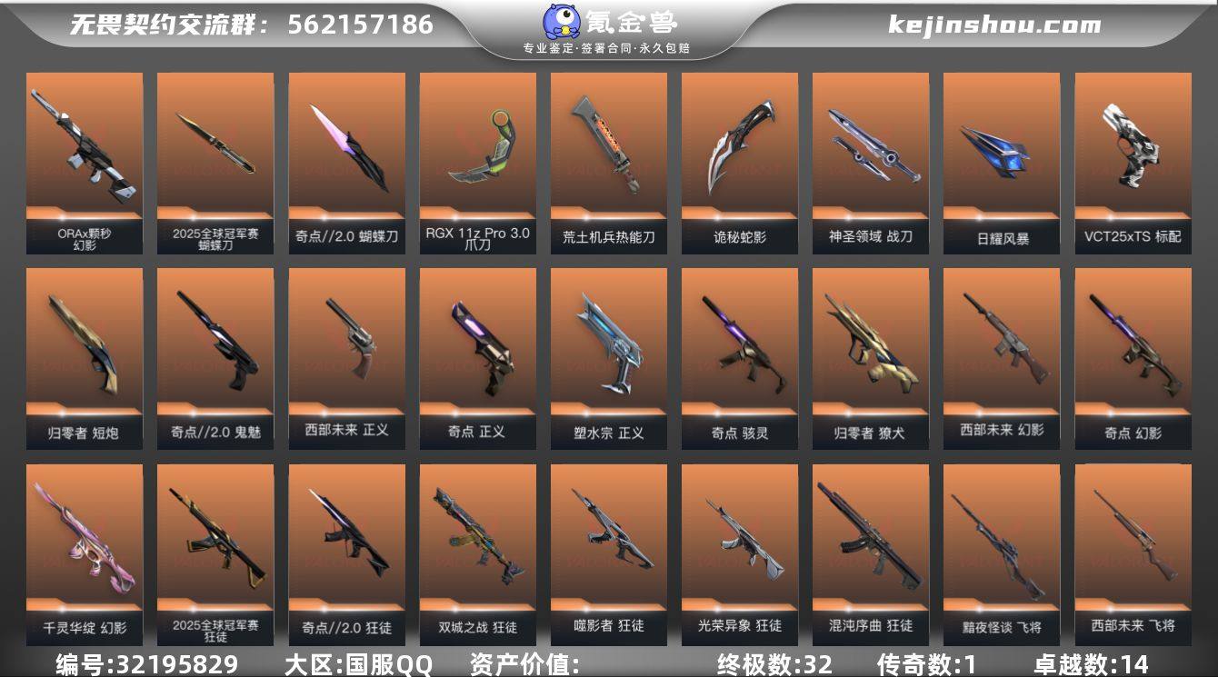 【套装】:2025全球冠军赛套装,西部未来套装,奇点//2.0套装,回火礼包:奇点套装,神中神罚套装,般若假面//2.0套装 【英雄】:幻棱,炼狱,维斯,暮蝶,钛狐,壹决,铁臂,捷风,雷兹,幽影,不死鸟,贤者,猎枭,蝰蛇,零,芮娜,奇乐,尚勃勒,霓虹,斯凯,夜露,星礈,K/O,海神,盖可,黑梦,钢锁 【近战武器】:近战武器-2025全球冠军赛 蝴蝶刀,近战武器-碎心裂刃,近战武器-神之刃,近战武器-奇点//2.0 蝴蝶刀,近战武器-RGX 11z Pro//3.0 爪刀,近战武器-黑波之刃,近战武器-鬼丸国纲,近战武器-未来开拓者,近战武器-荒土机兵 热能刀,近战武器-诡秘蛇影 军刀,近战武器-神圣领域 战刀,近战武器-日耀风暴 遗器 【狂徒】:狂徒-2025全球冠军赛,狂徒-混沌序曲,狂徒-奇点//2.0,狂徒-双城之战,狂徒-噬影者,狂徒-光荣异象,狂徒-般若假面//2.0,狂徒-盖世英雄,狂徒-离子武器//2.0,狂徒-荒土机兵,狂徒-诡秘蛇影 【幻影】:幻影-奇点,幻影-千灵华绽,幻影-西部未来,幻影-ORA x 颗秒,幻影-侦察力量,幻影-神中神罚,幻影-神圣领域,幻影-纳米打击,幻影-末日之翼,幻影-西部未来 【戍卫】:戍卫-天界神兵,戍卫-逆冲蛮牛,戍卫-月球哨兵,戍卫-折光棱晶 【獠犬】:獠犬-归零者,獠犬-般若假面//2.0,獠犬-神圣领域,獠犬-逆冲蛮牛 【冥驹】:冥驹-堕天遗武,冥驹-荒土机兵,冥驹-星云暗涌 【飞将】:飞将-黯夜怪谈,飞将-西部未来,飞将-末日之翼 【莽侠】:莽侠-神中神罚,莽侠-诡秘蛇影,莽侠-月球哨兵 【战神】:战神-般若假面//2.0,战神-神圣领域 【奥丁】:奥丁-西部未来,奥丁-纳米打击,奥丁-末日之翼 【判官】:判官-诡秘蛇影,判官-纳米打击x 【雄鹿】:雄鹿-紫阙金琅//2.0,雄鹿-逆冲蛮牛,雄鹿-月球哨兵 【骇灵】:骇灵-奇点,骇灵-神中神罚,骇灵-荒土机兵,骇灵-星云暗涌 【蜂刺】...